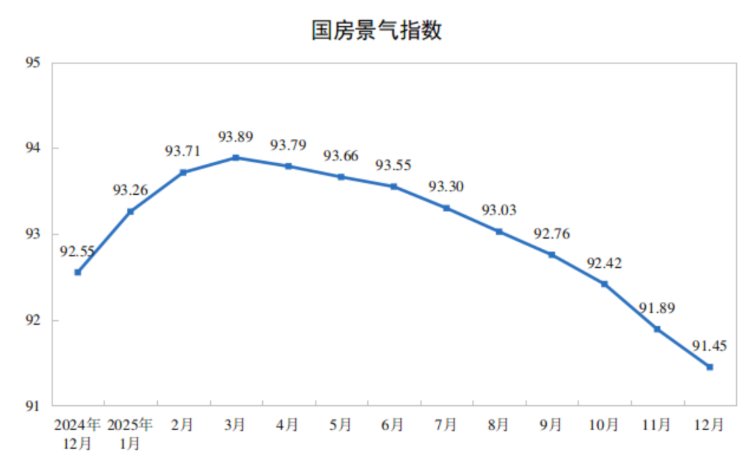 Core Viewpoint - The National Real Estate Development Prosperity Index in China dropped to 91.45 in December 2025, marking the ninth consecutive month of decline since April 2025, following an eleven-month increase from May 2024 to March 2025 [1] Group 1: Index Performance - The National Real Estate Development Prosperity Index is based on 2012 as the base year, with a growth level set at 100 [1] - A score of 100 indicates an optimal prosperity level, while scores between 95 and 105 represent moderate prosperity [1] - Scores below 95 indicate low prosperity levels, and scores above 105 indicate high prosperity levels [1]