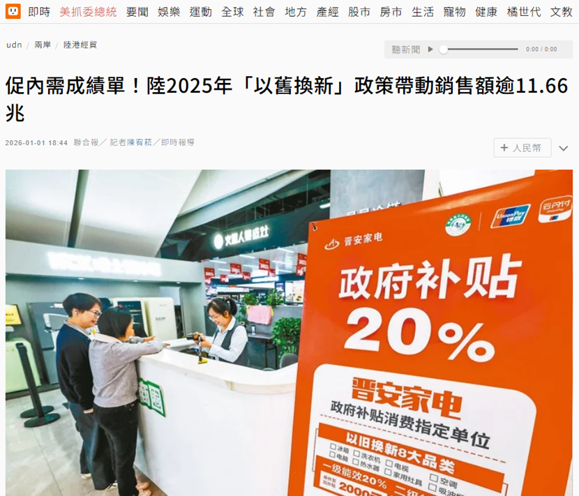 联合新闻网近日发文称,为刺激内需,中国内地2025年安排人民币3000亿元超长期特别国债资金,用于支持消费 品"以旧换新"政策,也就是民众口中的"国补"。据官方公布数据显示,"国补"政策全年带动相关商品销售额超过人民 币2.6兆元,惠及超过3.6亿人次。 【环球网财经综合报道】日前,商务部等九部门联合发文实施绿色消费推进行动,从丰富绿色产品供给、提升绿色服 务消费、创新绿色消费模式等7方面20条具体举措。支持消费者购买新能源汽车。鼓励购买获得绿色产品认证的绿色 智能家电产品、无氟空调等。 报道还提到,"以旧换新"政策自2024年9月全面实施以来,已累计发放直达消费者的补贴超过4.8亿份。2025年每卖出2 辆家用新车,就有1辆享受了汽车以旧换新补贴。该政策也让更多消费者选择到店体验购物并享受补贴,家电以旧换 新线下实体门店较为集聚的商圈,周边1公里范围内相关商户消费额增长超30%。 此外,2026年将继续推动消费品"以旧换新"政策,首批625亿元人民币超长期特别国债已在2025年12月30日公告下 达。 ...