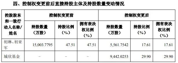 转让后原控股股东仍持股超16% 公告显示,初琳本次9442万股的协议转让价格为20.76元/股,较新亚强11月25日收盘价18.02元/股溢价约15.2%。如按照25日涨停前 (周一,11月24日)的收盘价16.38元/股来计算,则溢价约26.74%。 如本次股权转让顺利实施,城欣基金将持有新亚强29.9%股份,成为公司控股股东。不过,初琳并未将其所持的股份全部转让——本 次转让后,其仍持股16.09%;初琳及一致行动人初亚军仍合计持股17.61%。 | 控股股东 和一致行 | 控制权变更前 | | | 控制权变更后 | | | | --- | --- | --- | --- | --- | --- | --- | | 动人名称/ | 持股数量 | 持股比例 | 拥有表决 权比例 | 持股数量 | 持股比例 | 拥有表决 权比例 | | 姓名 | (万股) | (%) | (%) | (万股) | (%) | (%) | | 初琳、初亚 ਲ | 15.003.7795 | 47.51 | 47.51 | 5.561.7542 | 17.61 | 17.61 | | 城欣基金 | | | | 9.442.025 ...