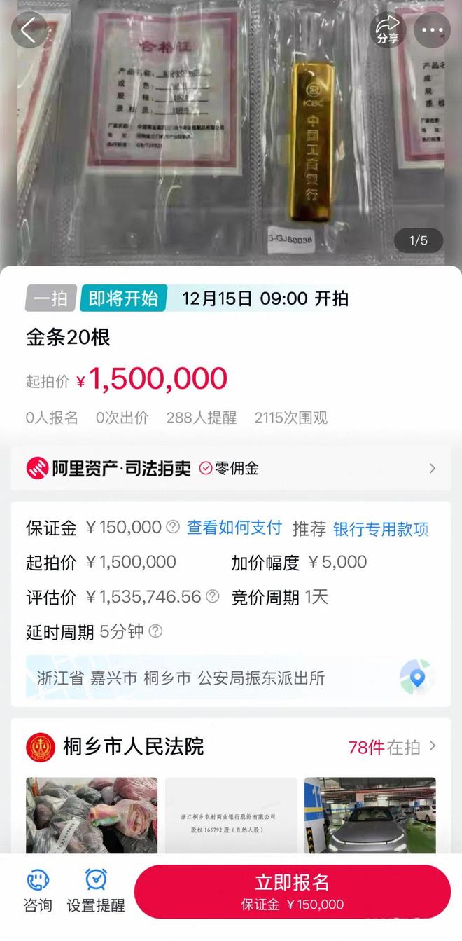 Group 1 - The international gold price has shown a trend of fluctuating upward recently, leading to opportunities for investors [1] - A batch of gold bars, consisting of 20 pieces weighing approximately 100 grams each, will be auctioned by the Tongxiang People's Court on December 15 [4] - The starting price for the 20 gold bars (totaling 1999.67 grams) is set at 1.5 million yuan (approximately 750 yuan per gram), which is significantly lower than the current market price due to the evaluation date being July 16 [6] Group 2 - The assessed price for the gold bars is 1.5357 million yuan, based on the international gold price on the evaluation date [6] - Potential bidders are advised to confirm the authenticity of the items and whether the court supports mailing before participating in the auction [7] - It is emphasized that bidders should act rationally and be aware of the legal responsibilities associated with auction participation [7]