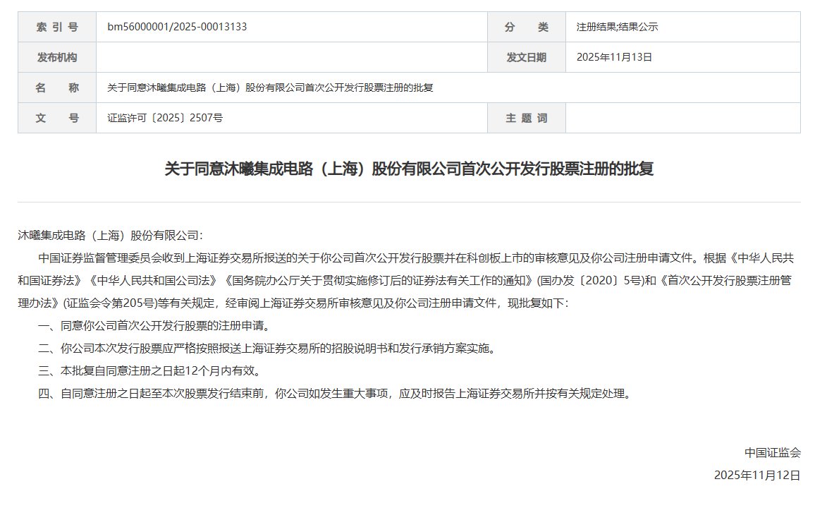 Core Viewpoint - The China Securities Regulatory Commission has approved the initial public offering (IPO) registration of Muxi Integrated Circuit (Shanghai) Co., Ltd., which plans to raise 3.904 billion yuan on the Shanghai Stock Exchange's Sci-Tech Innovation Board [1]. Group 1: Company Overview - Muxi Integrated Circuit specializes in the research, design, and sales of full-stack GPU products used in artificial intelligence training and inference, general computing, and graphics rendering [1]. - The company has launched several GPU product lines, including the Xisi N series for intelligent inference, the Xiyun C series for training and general computing, and is developing the Xicai G series for graphics rendering [1]. Group 2: Business Applications - Muxi Integrated Circuit is one of the few GPU suppliers that have achieved large-scale commercial applications of thousands of card clusters and is working on the implementation of ten thousand card clusters [1]. - The company has successfully supported the full pre-training of large models, such as the 128B MoE model, and has extensive compatibility with upstream and downstream ecosystems, including server hardware, operating systems, management platforms, mainstream AI frameworks, and major large models [1].