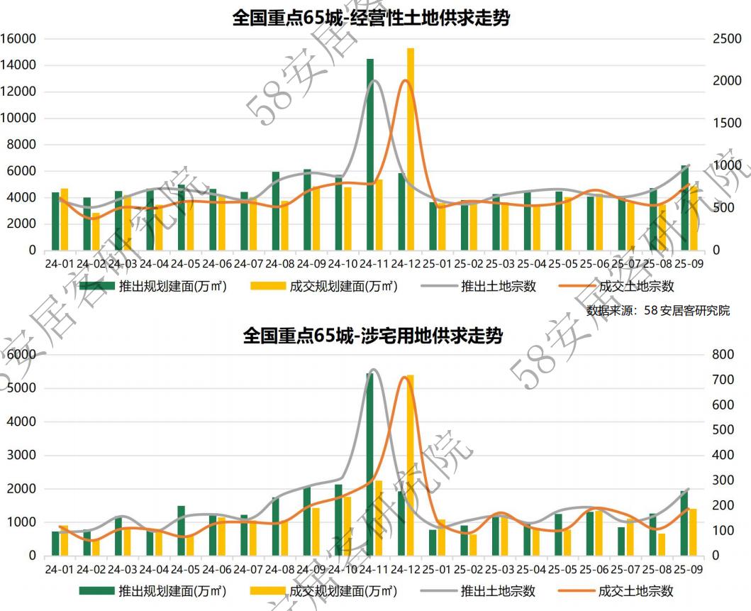 9月,全国65个重点城市的经营性土地出让金总额达到1291亿元。受本月土地成交规模环比回升的推动,出让金规模环比增长88%,但同比仍下降17%。 此外,本月土地成交楼面价环比上涨34%,回升至2661元/㎡,同比依然下降16%。总体来看,鉴于8月土地成交表现不佳,在低基数效应的影响下,本月 环比回升态势显著,然而与去年同期相比,整体表现仍显疲弱。 结合65个重点城市经营性土地的成交结构情况,本月涉宅用地的成交规模占比较上月上升9.7%,占比回升至29%。商办用地的成交规模占比较上月也上升 3.4%,保持在9.3%。与此同时,工业用地的成交规模占比则显著下降18%,占比降至54.6%。 2、9月,涉宅用地出让金规模环比回升91% 一、全国重点65城土地市场概况 1、9月重点65城土地成交规模显著回升,涉宅成交环比涨110% 9月,全国65个重点城市共推出经营性土地1007宗,推出量达到年内峰值。前三季度土地供应规模持续攀升,本月环比增长37%。同时,本月总计成交各 类经营性土地780宗,成交规划建筑面积达4848.71万平方米,成交规模环比提升40%,同比保持稳定。 在涉宅用地领域,9月份全国65个重点城市累计 ...