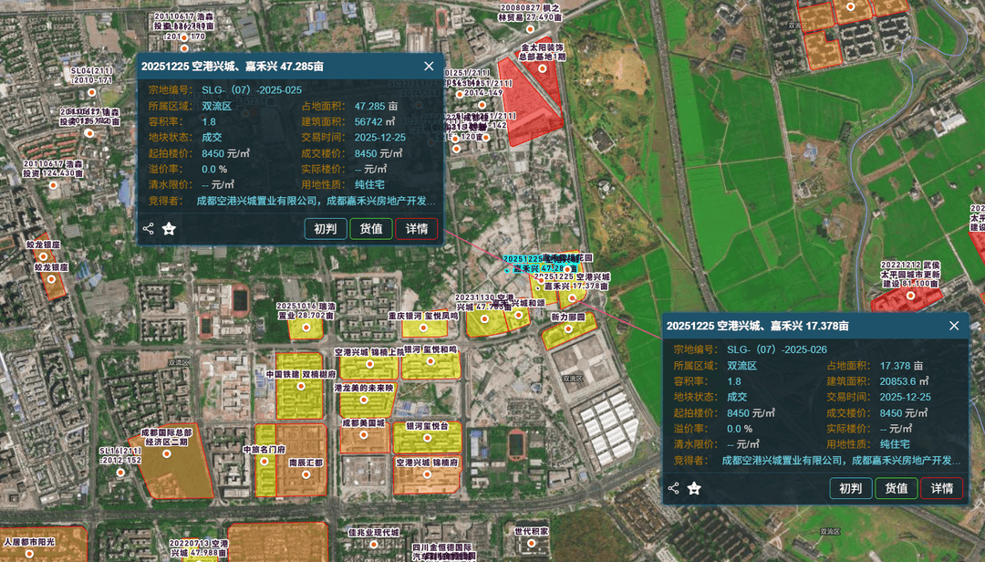 封面新闻记者 黄益辉 12月25日,双流区集中拍卖4宗纯住宅用地,总面积达10.92万平方米,规划建筑面积20.97万平方米,起始总价19.77亿元。最终,所有地块均由成都空港 兴城置业有限公司与成都嘉禾兴房地产开发有限公司组成的联合体竞得,合计成交金额19.77亿元,溢价率均为0%。 其中,位于双流东升街道的两宗相邻地块采取组合供应方式,面积分别为47.2亩和17.3亩,容积率1.8,总起始价6.56亿元,成交楼面价8450元/平方米。 2025年临近岁末,成都市双流区迎来了年内规模最大的一次单日土地供应。 图据寻圭云图 另外两宗地位于双流怡心街道,面积分别为21.8亩和77.2亩,容积率2.0,起始楼面价10000元/平方米,成交总价分别为2.91亿元和10.3亿元。 图据寻圭云图 截至目前,嘉禾兴地产今年已在成都竞得11宗住宅用地,成为当地拿地数量最多的房企。 公开资料显示,嘉禾兴地产集团于2019年底在成都注册成立成都嘉禾兴房地产开发有限公司,但直至2023年才正式进入成都市场——当年4月,该公司在 温江永宁取得一宗41.7亩的土地。 此后短短两年多时间里,嘉禾兴已完成在成都二圈层所有区域的布局。其项 ...