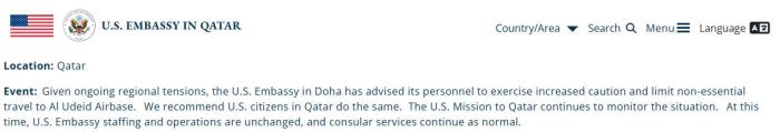 美驻卡塔尔使馆发布安全提示:建议工作人员提高警惕