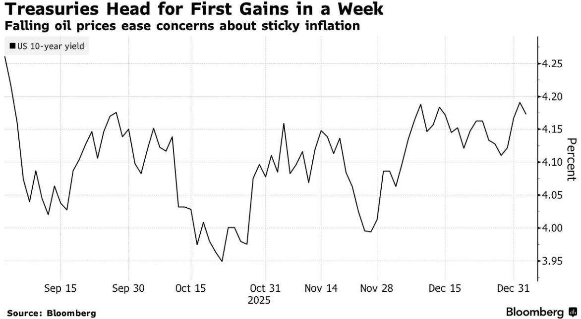 智通财经APP注意到,美债有望迎来一周以来的首次上涨,此前美军逮捕委内瑞拉总统马杜罗导致油价下跌,缓解了市场对通胀持续的担忧。 10年期美债收益率下跌2个基点至4.17%,而对货币政策更为敏感的2年期美债收益率下跌1个基点至3.46%。货币市场已完全消化了美联储今年将两次下调25 个基点借贷成本的预期,并认为第三次降息的可能性约为25%。 尽管地缘政治担忧的加剧通常会刺激对美债等避险资产的需求,但受科技股上涨推动,美国股指期货周一走高。美债表现也滞后于掉期合约,这信号显示出 风险偏好的回升。 德意志银行策略师亨利·艾伦及其团队表示,"从历史上看,地缘政治冲击往往不会产生持久影响,""这似乎令人惊讶,但这是因为市场通常是根据增长和通 胀等宏观变量进行交易,而非地缘政治冲击本身。" 在周五关键的就业报告发布前,交易员接下来将关注周一晚些时候公布的美国12月ISM制造业数据,以寻找有关经济健康状况的最新线索。 周一,由于市场担心全球供应过剩导致原油期货价格下跌,全球大多数债券随之上涨。即便委内瑞拉未来恢复石油产量,也仅是补足过去二十年暴跌的产 能,而今年随着欧佩克+及其他产油国持续增产,市场仍将面临巨大过剩。 ...