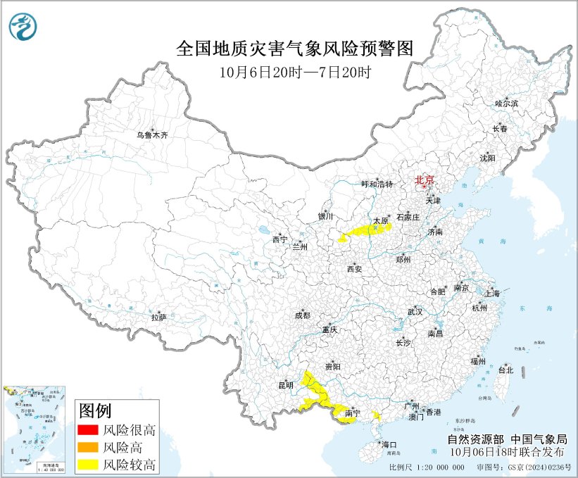 各级政府及有关部门按照应急预案做好地质灾害防御工作。请社会公众及时关注地质灾害气象风险预警信息,谨慎 前往地质灾害预警区域。黄色预警区内人员,请随时关注预警信息变化,注意附近警示标志,避免在沟谷、斜坡、 陡崖(坎)等高风险地带逗留。 央视网消息:自然资源部与中国气象局10月6日18时联合发布地质灾害气象风险预警:预计,10月6日20时至7日20 时,山西中南部、广东西南部、广西南部和西部、贵州西南部、云南东部、陕西北部、甘肃东部等地部分地区发生 地质灾害的气象风险较高(黄色预警)。 ...