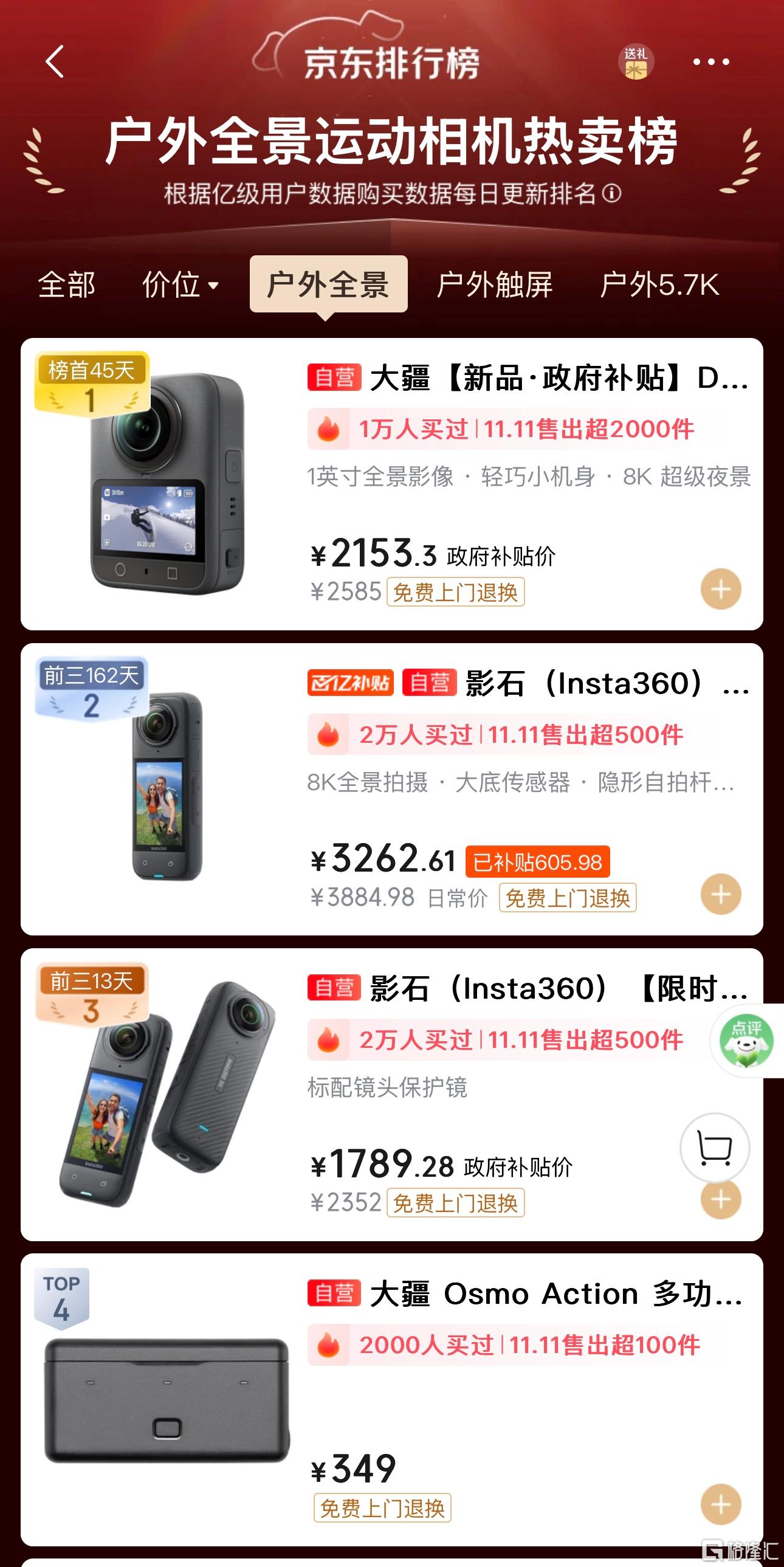 大疆全景相机、运动相机全面霸榜京东热卖榜