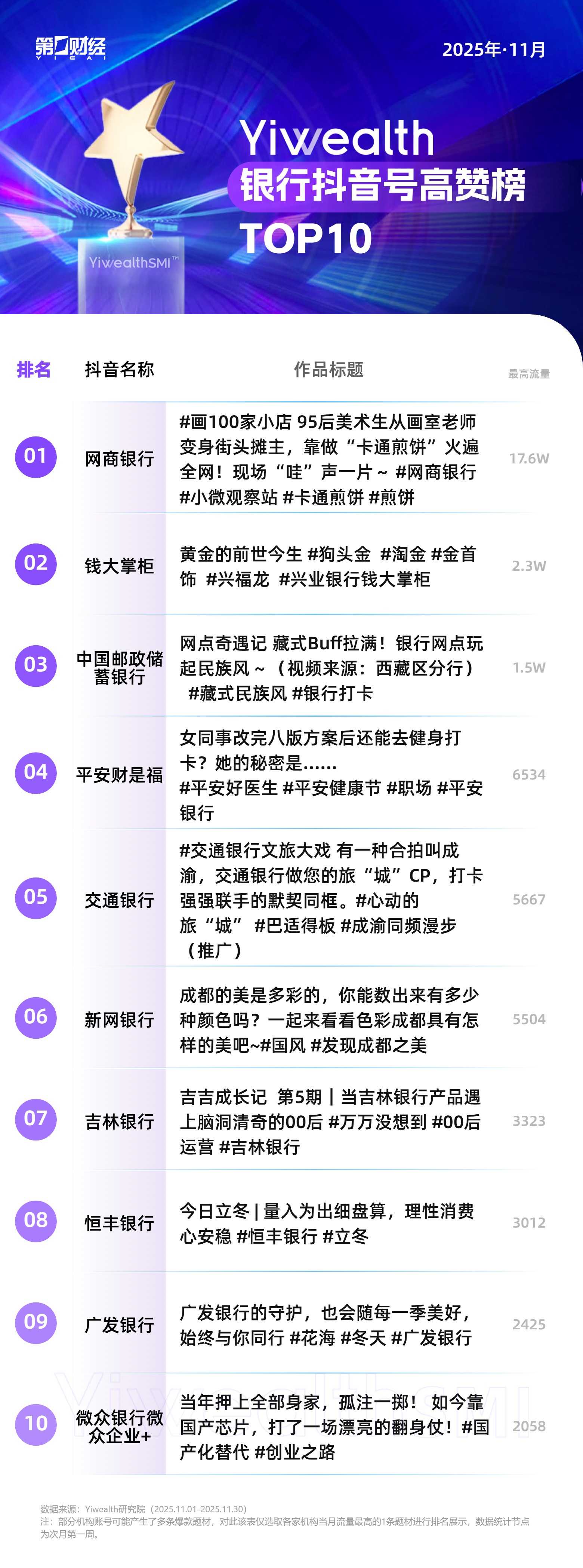 本期为银行社交媒体指数(2025年11月)。 本期为银行社交媒体指数(2025年11月)。 11月银行SMI总榜整体维持小幅波动,但榜单尾部经历了显著洗牌。中信银行(10月Top10)、天津银行(10月Top14)、长沙银行(10月Top16)、江西银 行(10月Top19)跌出榜单。兴业银行(Top2)、重庆银行(Top16)、浙商银行(Top17)、郑州银行(Top20)入榜。值得注意的是,兴业银行近三个月 排名呈现较大波幅,主要归因于其旗下抖音号"钱大掌柜"的更新频率不稳定,导致分项指数跳动明显,进而拖累SMI总指数。这说明定时更新且均衡运营有 助于排名稳定。 在11月的高赞榜中,除了网商银行《画100家小店》继续霸榜外,"创意剧情"成为了新的流量密码。 银行广告怎么拍才不招人烦?平安银行和吉林银行交出了高分答卷。平安银行选择了经典的"职场社畜"题材,通过男同事好奇女同事改了8版方案还能有精 力去健身的悬念,引出平安口袋银行App中的"AI医生"功能;吉林银行则展示了运营小组为了策划消费贷产品宣传的幕后故事,视频中00后的脑洞与组长的 需求battle,过程有趣且自然地带出了产品卖点。 除了剧情,"场景 ...