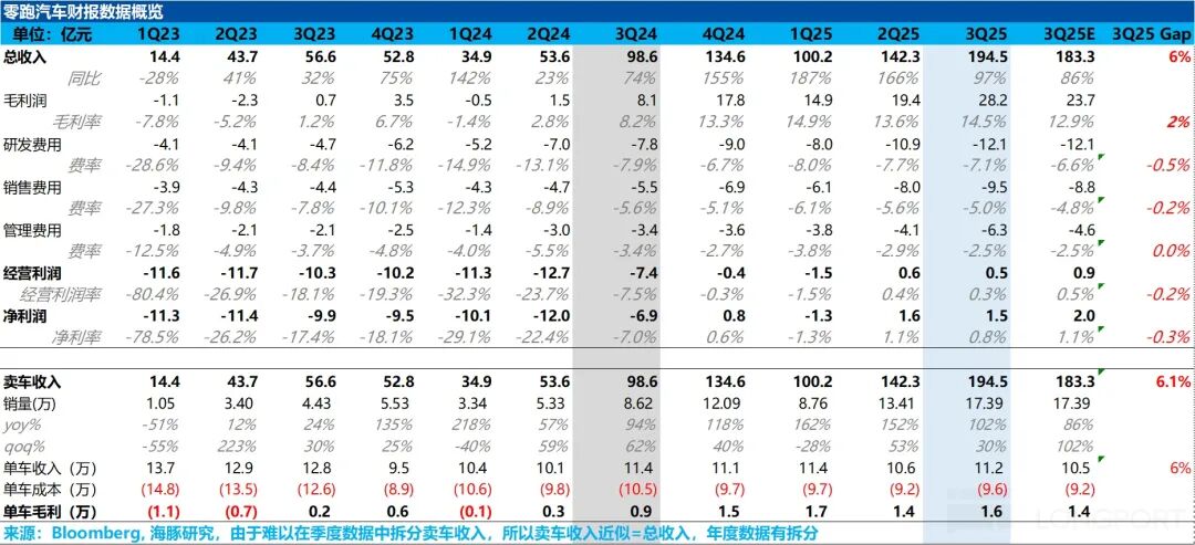 Core Viewpoint - Leap Motor's Q3 2025 financial report shows mixed results, with revenue exceeding expectations but net profit declining due to increased expenses [1][4]. Revenue Performance - Total revenue for Q3 reached 19.45 billion, significantly surpassing market expectations of 18.33 billion, primarily due to the recognition of 2.5 billion in carbon credit income and a rebound in vehicle selling prices [1][4]. - The average selling price of vehicles increased to 112,000, up by 6,000 from the previous quarter, contrary to market expectations of a decline [1][4]. Profitability Metrics - The vehicle gross margin rose by 0.9 percentage points to 14.5%, exceeding the market expectation of 12.9%, driven by higher selling prices, carbon credit income, and economies of scale [1][4]. - Despite the positive gross margin, net profit fell to 150 million, below the market expectation of 200 million, due to increased operating expenses [2][4]. Expense Analysis - R&D expenses increased to 1.2 billion, reflecting ongoing investments in smart technology and channel expansion [1][2]. - Selling expenses rose to 950 million, exceeding market expectations, as the company expanded its retail channels and increased marketing efforts [2][4]. Future Outlook - For Q4 and 2026, the company aims for a gross margin of 14%-15% and a net profit of 500-1,000 million for the full year 2025, with projected sales of 580,000 to 650,000 vehicles [5][6]. - The company is implementing promotional strategies to boost sales, including cash subsidies on various models, and anticipates Q4 sales to reach 218,000 vehicles, a 25% increase from the previous quarter [6][4]. Competitive Positioning - Leap Motor's strategy focuses on high vertical integration and self-sourcing, aiming to enhance cost advantages and offer high-value models to price-sensitive consumers [9]. - The partnership with Stellantis is expected to strengthen Leap Motor's overseas expansion, leveraging Stellantis's brand and distribution channels in Europe [9].