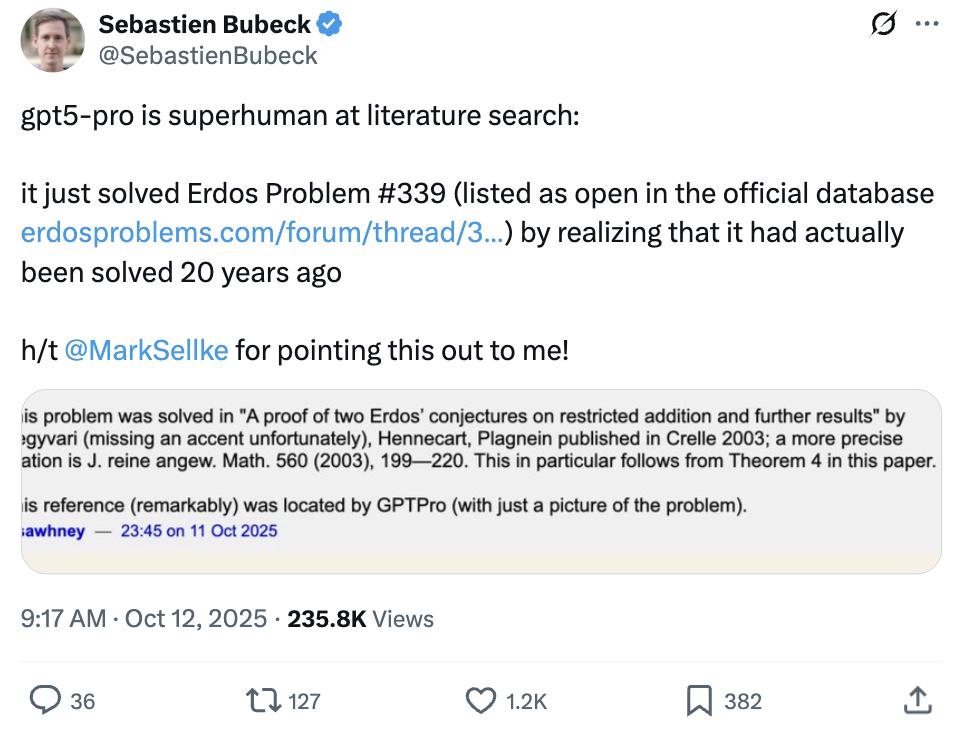 西风 发自 凹非寺 量子位 | 公众号 QbitAI 人类遗忘的难题解法,被GPT-5 Pro重新找出来了! 这事儿聚焦于 埃 尔德 什 问 题 #339 ,这是著名数学家 保罗・埃 尔德 什 提出或转述的近千道问题之一,收录于erdosproblems.com网 站。该网站记录了每道题目的当前状态,其中约三分之一已解决,大部分仍待解。 尤其值得关注的是,GPT-5 Pro仅通过埃尔德什问题 #339的图片 ,直接定位到了关键文献。 此前该问题被标为处于"未解决"状态 ,属于待攻克的数学难题,不少人还在继续研究探讨。 直到最近,有人用GPT-5 Pro检索后才发现,该问题 实 际在 2003年就 已被解决了 。 OpenAI研究员Sebastien Bubeck将此事分享出来后立马引发大量网友关注。 By the way,陶哲轩的著名成果之一,就是通过"遍历理论 (ergodic theory ) "工具,突破了"埃尔德什差异问题"这一困扰数学界几十年的 猜想。 问题详情 具体来看,埃尔德什问题 #339是数论中加法基方向的一个经典问题 ,表述为: 设A⊆N是一个r阶基(即每个足够大的整数都能表示为A中r个元 ...