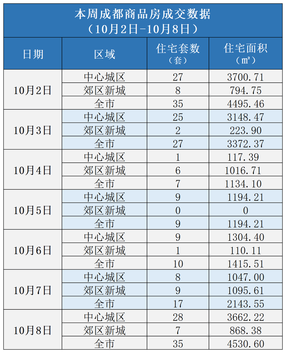 一、土地市场 本地市场:10月2日-10月8日,成都暂无土地交易。 二、成交数据 成都商品房成交: | | | 本周成都商品房成交数据 | | | --- | --- | --- | --- | | | | (10月2日-10月8日) | | | 日期 | 区域 | 住宅套数 | 住宅面积 | | | | (套) | ( m2 ) | | 10月2日 | 中心城区 | 27 | 3700. 71 | | | 郊区新城 | 8 | 794. 75 | | | 全市 | 35 | 4495. 46 | | 10月3日 | 中心城区 | 25 | 3148. 47 | | | 郊区新城 | 2 | 223. 90 | | | 全市 | 27 | 3372. 37 | | 10月4日 | 中心城区 | 1 | 117. 39 | | | 郊区新城 | 6 | 1016. 71 | | | 全市 | 7 | 1134.10 | | 10月5日 | 中心城区 | 9 | 1194. 21 | | | 郊区新城 | 0 | 0 | | | 全市 | 9 | 1194. 21 | | 10月6日 | 中心城区 | 9 | 1 ...