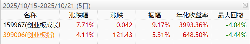 Core Insights - The communication sector has outperformed the market recently, contributing to a significant rise in the Growth ETF of the ChiNext board, which increased by 7.71% from October 15 to October 21, compared to a 4.11% rise in the ChiNext index, resulting in an excess return of 3.6 percentage points [1][2]. Group 1: ETF Performance - The ChiNext Growth ETF (159967) recorded a rise of 7.71% with a maximum drawdown of -4.04% and an annualized return of 3993.36% [2]. - The ChiNext index (399006) increased by 4.11% with a maximum drawdown of -4.44% and an annualized return of 648.50% [2]. Group 2: Sector Allocation - The ChiNext Growth Index has a significant overweight in the communication sector, accounting for 35.5% of its holdings, while the ChiNext index holds 16.1% in the communication sector [2]. Group 3: Industry Catalysts - A recent catalyst for the communication industry is the notice issued by the Ministry of Industry and Information Technology on October 16, 2025, which aims to develop a high-speed, low-latency, and widely covered metropolitan network by 2027 [2].