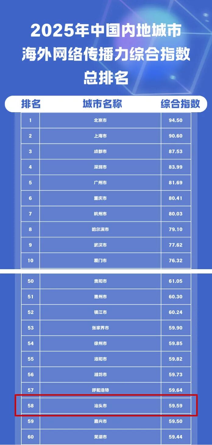 转自:汕头发布 近日 北京师范大学新媒体传播研究中心 联合中国日报网、光明网等单位 共同发布了 《2025中国城市海外网络传播力 建设系列报告》 报告对全国338座内地城市的 国际网络传播效能进行全面评估 汕头市以59.59分的成绩 位列总榜单第58名 再次彰显了城市在国际传播领域 的持续突破与影响力提升 | 排名 | 城市名称 | 综合指数 | | --- | --- | --- | | 1 | 北京市 | 94.50 | | 2 | 上海市 | 90.60 | | 3 | 成都市 | 87.53 | | 4 | 深圳市 | 83.99 | | 5 | 广州市 | 81.69 | | 6 | 屋庆市 | 80.41 | | 7 | 杭州市 | 80.03 | | 8 | 哈尔滨市 | 79.10 | | 9 | 武汉市 | 77.62 | | 10 | 厦门市 | 76.32 | | 50 | 贵阳市 | 61.05 | | --- | --- | --- | | 51 | 隠州市 | 60.30 | | 52 | 镇江市 | 60.24 | | 53 | 张家界市 | 59.90 | | 54 | 徐州市 ...