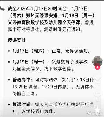 由于河南气象发布暴雪通知,网传郑州市中小学和幼儿园周一停课,记者从郑州市相关部门获悉,暂未 接到相关停课通知。 郑州发布 供水方面,加强对制水设备设施和管网、泵站、水表等安全检查维护,指导用户提前做好供水设施防寒 防冻工作,全天候监测管网流量、水质和水压情况,加强科学调度,确保水量足、水质优、水压稳。 供气方面,发挥气源应急调峰能力,提前储备LNG在紧急情况下作为补充气源,确保尖峰时段"供得 上、靠得住",同时持续开展燃气设施隐患排查治理和风险分级管控工作,确保管网、厂站平稳安全运 行。 广告路灯方面,对户外广告和门头招牌进行安全隐患排查,一旦发现安全隐患,立即督促采取加固措 施。绿化景观方面,加密巡查频次及时发现处理树木倒伏、歪斜、断枝等风险和问题,防止伤人或影响 通行。桥梁隧道方面,及时组织人员巡查清除高架桥、人行天桥、下穿隧道的路面结冰和冰挂冰柱,保 障市民出行安全。 郑州热力 道路结冰黄色预警 郑州市气象台2026年1月18日10时10分发布道路结冰黄色预警信号:受降水和低温影响,预计未来24小 时内,郑州市主城区、航空港区、上街区所辖乡镇及街道路表温度低于0℃,将出现对交通有较大影响 的道路结冰,请 ...