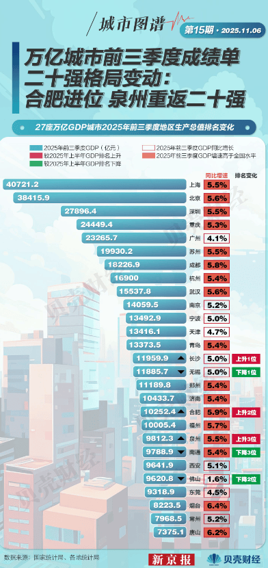 在经济浪潮的跌宕起伏中,万亿城市之间的竞争宛如一场没有硝烟却异常激烈的战争,每一次数据更新 都牵动着各方的神经。截至11月6日,27座万亿城市前三季度经济数据全部揭晓,一幅动态的城市经济 竞争画卷徐徐展开,其中既有领跑者的风采,也有后来者的追赶,更有排名变动带来的惊喜与遗憾。 增速比拼:烟唐合领跑,17城超全国 在这场经济增速的较量中,各城市展现出不同的活力与潜力。烟台以6.4%的GDP增速继续领跑,宛如 一匹黑马在赛道上疾驰,其强劲的发展势头为其他城市树立了标杆。唐山和合肥也不甘示弱,分别以 6.2%、5.9%的增速紧随其后,分列第二、第三。值得一提的是,此次共有17座城市的GDP增速跑赢了 全国增速,这充分显示出这些城市在经济发展中的韧性和活力,它们正以各自的方式在经济的舞台上绽 放光彩。 二十强风云:泉升通跌,合进佛退 年内,万亿城市"二十强"榜单可谓是变动不断,犹如一场精彩绝伦的排位赛。泉州无疑是这场比赛中的 亮点之一,它连续两个季度排名上升,凭借着坚韧不拔的发展劲头,成功超过南通,重新回归前二十行 列。泉州的重返,不仅彰显了其自身经济的稳健发展,也为榜单带来了新的活力。 与之形成鲜明对比的是南通,上 ...
