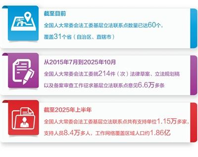 (来源:法治日报) 转自:法治日报 □ 赵晨熙 2025年,对基层立法联系点而言,是承前启后、继往开来的关键之年。从"大榕树下的议事 会"到"代表流动茶摊",从线下群众座谈到线上二维码征询,基层立法联系点10年深耕,让立法神经末 梢延伸至田间地头、市井巷陌,成为全过程人民民主在基层落地生根的生动实践。 立法的生命力在于 民意。当71岁的老人结合农业技术推广经验,提出的"加大科普展馆对青少年优惠力度"建议在科学技术 普及法修改时被采纳;当残障人士吴腾信希望能优化农村无障碍设施的建议最终被写入了无障碍环境建 设法,一个个充满"烟火气"的"金点子",让法律条文不再冰冷,而是满载生活温度与群众期盼。 从党 的十八届四中全会提出制度构想,到2023年写入立法法,基层立法联系点从实践探索上升为法律规范。 从立法征询到备案审查联动,从单一功能到"一点多能",基层立法联系点让群众真切感受到了"民主就 在身边"。 10年春华秋实,基层立法联系点用制度化、常态化实践,让立法更接地气、更贴民心。站在 新起点,基层立法联系点将继续承载人民的期望,让每一部法律都满载民意,成为守护民生的坚实屏 障,为法治中国建设注入不竭的民智力量。 ...