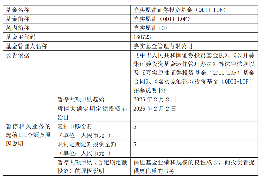 | 基金名称 | | 嘉实原油证券投资基金(QDII-LOF) | | --- | --- | --- | | 基金间称 | | 嘉实原油(QDII-LOF) | | 场内简称 | | 嘉实原油 LOF | | 基金主代码 | | 160723 | | 基金管理人名称 | | 嘉实基金管理有限公司 | | 公告依据 | | 《中华人民共和国证券投资基金法》、《公开募 | | | | 集证券投资基金运作管理办法》等法律法规以 | | | | 及《嘉实原油证券投资基金(QDII-LOF)基金 | | | | 合同》、《嘉实原油证券投资基金(QDII-LOF) | | | | 招募说明书》 | | | 暂停大额申购起始日 限制申购金额 | 2026年2月2日 5 | | | 暂停大额定期定额投资起 | 2026年2月2日 | | | 始日 | | | 暂停相关业务的 | | | | 起始日、金额及原 | (单位:人民币元 ) | | | 因说明 | 限制定期定额投资金额 | 5 | | | (单位:人民币元 ) | | | | 暂停大额申购(含定期定额 | 保证基金业绩和规模的良性成长,向投资者提 | | | 投资 ...