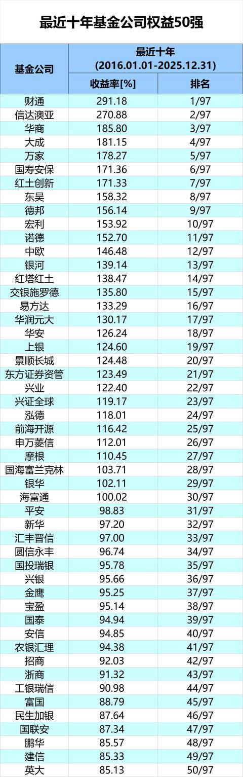 2025年正式收官,公募基金主动权益领域的年度业绩正式落定。 | 重要公司 | 最近十年 | | | --- | --- | --- | | | (2016.01.01-2025.12.31) | | | | 收益率[%] | 排名 | | 财通 | 291.18 | 1/97 | | 信达澳亚 | 270.88 | 2/97 | | रूझ | 185.80 | 3/97 | | 大成 | 181.15 | 4/97 | | 月家 | 178.27 | 5/97 | | 国寿安保 | 171.36 | 6/97 | | 红土创新 | 171.33 | 7/97 | | 乐吴 | 158.32 | 8/97 | | 德邦 | 156.14 | 9/97 | | 宏利 | 153.92 | 10/97 | | 诺德 | 152.70 | 11/97 | | 中欧 | 146.48 | 12/97 | | 银河 | 139.14 | 13/97 | | 红塔红土 | 138.47 | 14/97 | | 交银施罗德 | 135.80 | 15/97 | | 易方达 | 133.29 | 16/97 | | 华润元 ...