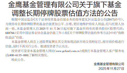 中国经济网北京11月27日讯 今日,金鹰基金管理有限公司发布关于旗下基金调整长期停牌股票估 值方法的公告。 公告称,根据中国证监会《关于证券投资基金估值业务的指导意见》(证监会公告[2017]13号), 为使持有长期停牌股票的基金估值更加公平、合理,更好地维护持有人利益,经与托管人协商一致,基 金管理人自2025年11月26日起对旗下基金所持有的普冉股份(股票代码:688766)采用中国证券业协会 基金估值工作小组《关于停牌股票估值的参考方法》中的"指数收益法"估值。 (责任编辑:郭健东 ) 【免责声明】本文仅代表作者本人观点,与和讯网无关。和讯网站对文中陈述、观点判断保持中立,不对所包含内容 的准确性、可靠性或完整性提供任何明示或暗示的保证。请读者仅作参考,并请自行承担全部责任。邮箱: news_center@staff.hexun.com 基金管理人将在上述股票复牌且其交易体现活跃市场交易特征后,按市场价格进行估值,届时不再 另行公告。 ...
