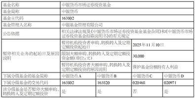 Core Viewpoint - The announcement details the suspension of certain investment activities for the Zhongyin Currency Market Fund, effective November 10, 2025, to protect the interests of fund shareholders [1][2]. Group 1: Fund Suspension Details - From November 10, 2025, the fund will suspend accepting institutional investors' applications for single-day purchases, conversions, and regular investment plans exceeding 30,000 yuan (excluding 30,000 yuan) [2]. - The suspension applies to all classes of the fund, including A, B, and D shares, and the company reserves the right to refuse applications that exceed this limit [2]. Group 2: Fund Management and Operations - The fund is managed by Zhongyin Fund Management Co., Ltd., and the announcement is based on relevant laws and regulations [1]. - The fund's net asset value was reported at 41.8567 million yuan as of June 11, 2025, indicating a continuous decline below the 50 million yuan threshold for 60 consecutive working days [7][40]. Group 3: Shareholder Meeting - A shareholder meeting will be held to discuss the proposal for the fund's continued operation, with voting starting from November 11, 2025, to December 8, 2025 [8][12]. - The meeting will be conducted via communication methods, and shareholders must register their rights by November 10, 2025, to participate [13][12]. Group 4: Voting Procedures - Shareholders can vote through paper ballots or online methods, with specific instructions provided for both individual and institutional investors [14][17]. - The voting process will be supervised by designated personnel, and the results will be certified by a notary [30][38].