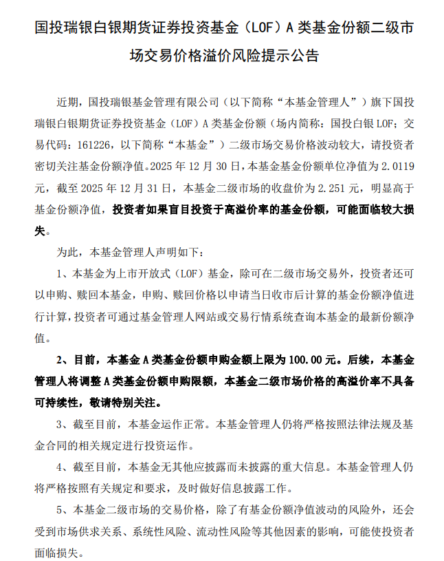 (来源:财闻) 截至2025年12月31日,本基金二级市场的收盘价为2.251元,明显高于基金份额净值,投资者如果盲目 投资于高溢价率的基金份额,可能面临较大损失。 1月4日,国投瑞银白银期货证券投资基金(LOF)A类基金份额发布二级市场交易价格溢价风险提示公 告。近期,国投白银LOF A类基金份额二级市场交易价格波动较大,请投资者密切关注基金份额净值。 2025年12月30日,本基金基金份额单位净值为2.0119元,截至2025年12月31日,本基金二级市场的收盘 价为2.251元,明显高于基金份额净值,投资者如果盲目投资于高溢价率的基金份额,可能面临较大损 失。 场交易价格溢价风险提示公告 公告称,目前,本基金A类基金份额申购金额上限为100.00元。后续,本基金管理人将调整A类基金份 额申购限额,本基金二级市场价格的高溢价率不具备可持续性,敬请特别关注。 近期,国投瑞银基金管理有限公司(以下简称"本基金管理人")旗下国投 瑞银白银期货证券投资基金(LOF)A类基金份额(场内简称:国投白银 LOF:交 易代码:161226,以下简称"本基金")二级市场交易价格波动较大,请投资者 密切关注基金份额净值。20 ...