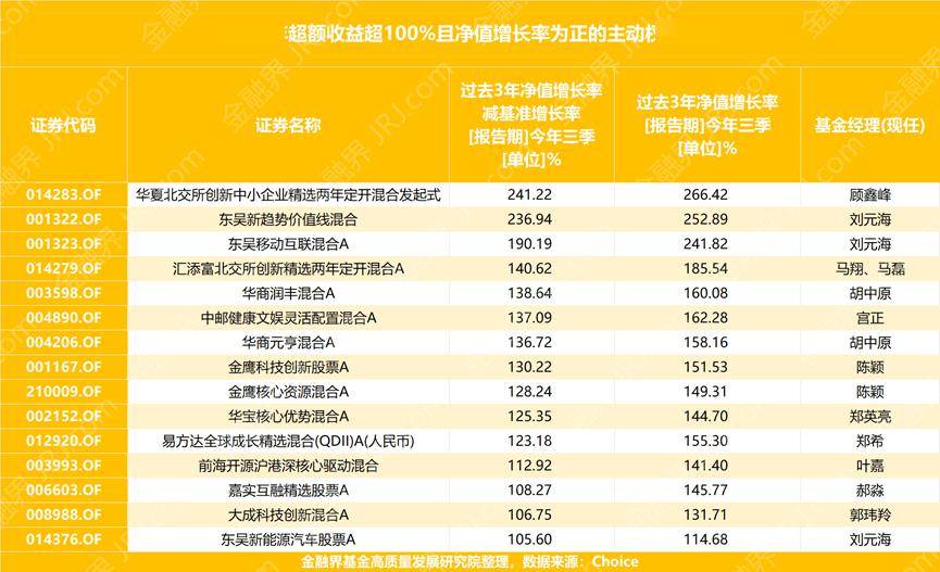 在众多基金中,还有哪些基金经理最有可能涨薪呢? | | | 超额收益超100%目净值增长率为正的主动榜 | | | | --- | --- | --- | --- | --- | | 证券代码 | 证券名称 | 过去3年净值增长率 或者是相关率 [凝管期]今年三季 [章位]% | 过去3年净值增长率 【报告期】今年三季 [章位]% | 基金经理(现任) | | 014283.OF | 华夏北交所创新中小企业精选两年定开混合发起式 | 241.22 | 266.42 | 顾惑峰 | | 001322.OF | 东吴新趋势价值线混合 | 236.94 | 252.89 | 刘元母 | | 001323.OF | 东吴移动互联混合A | 190.19 | 241.82 | 刘元海 | | 014279.OF | 汇添富北交所创新精选两年定开混合A | 140.62 | 185.54 | 马翔、马磊 | | 003598.OF | 华商润丰混合A | 138.64 | 160.08 | 胡中原 | | 004890.OF | 中邮健康文娱灵活配置混合A | 137.09 | 162.28 | 富州E | | 0042 ...
