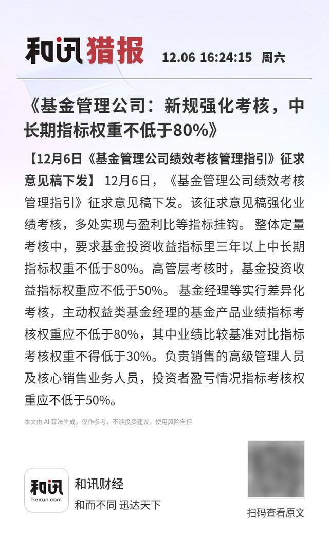 【12月6日《基金管理公司绩效考核管理指引》征求意见稿下发】12月6日,《基金管理公司绩效考核管 理指引》征求意见稿下发。该征求意见稿强化业绩考核,多处实现与盈利比等指标挂钩。整体定量考核 中,要求基金投资收益指标里三年以上中长期指标权重不低于80%。高管层考核时,基金投资收益指标 权重应不低于50%。基金经理等实行差异化考核,主动权益类基金经理的基金产品业绩指标考核权重应 不低于80%,其中业绩比较基准对比指标考核权重不得低于30%。负责销售的高级管理人员及核心销售 业务人员,投资者盈亏情况指标考核权重应不低于50%。 F FOG hexun.com 和讯财经 和而不同 迅达天下 扫码查看原文 本文由 AI算法生成,仅作参考,不涉投资建议,使用风险自担 ...