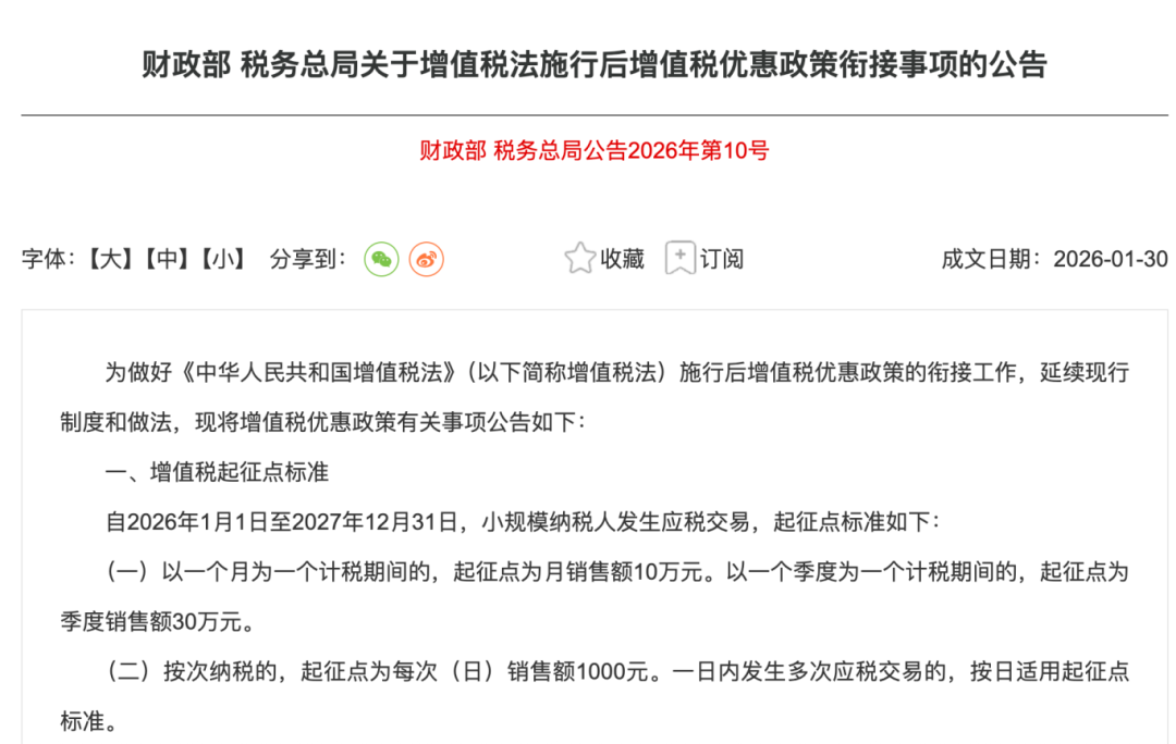 记者丨曾静娇 周潇枭 编辑丨刘雪莹 视频丨王学权 财政部、税务总局发布最新公告,2026年起增值税起征点再次提高,以减轻个人税负。 1月31日,据财政部网站消息,财政部、税务总局公布 《关于增值税法施行后增值税优惠政策 衔接事项的公告》 ,调整了增值税起征点,达不到起征点标准的纳税人不用缴纳增值税。 根据《公告》, 自2026年1月1日至2027年12月31日,小规模纳税人发生应税交易,起征点标 准如下: (一)以一个月为一个计税期间的,起征点为月销售额10万元。以一个季度为一个计税期间 的,起征点为季度销售额30万元。 财政部截图 (二)按次纳税的, 起征点为每次(日)销售额1000元。 一日内发生多次应税交易的,按日 适用起征点标准。 据第一财经,上述增值税按次纳税起征点提高无疑对个人等是一个重大利好。比如专家学者给 高校、企业授课的劳务费,每次或每天低于1000元,将不用缴纳增值税。个人跑外卖、撰稿等 打零工每次(每天)低于1000元,也不用缴纳增值税。 另据新华社报道,国家税务总局制发了《关于起征点标准等增值税征管事项的公告》,就起征 点标准判定、税收优惠政策适用等增值税征管事项作了进一步明确,细化操 ...