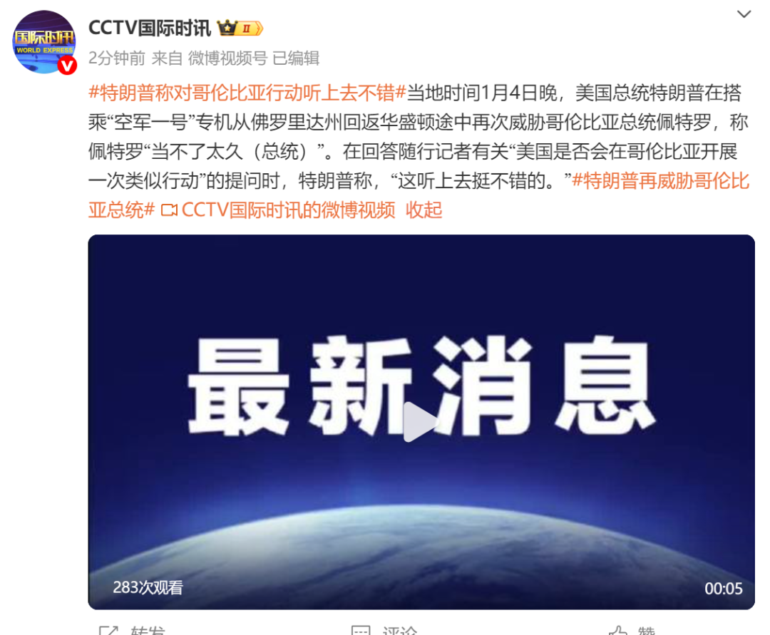 每经编辑|陈柯名 潘海福 当地时间1月4日晚,美国总统特朗普在搭乘"空军一号"专机从佛罗里达州回返华盛顿途中再次威胁哥伦比亚总统佩特罗,称佩特罗"当不了太久(总 统)"。在回答随行记者有关"美国是否会在哥伦比亚开展一次类似行动"的提问时,特朗普称,"这听上去挺不错的。" 佩特罗还在X平台上补充说,在这起轰炸中"已知有3人死亡,其余人员因跳海得以幸存。该信息由我们的海军部队提供,他们愿意就此协助调查"。 佩特罗 图片来源:视觉中国 据新华社,2025年10月19日和22日,特朗普两度公开宣称佩特罗是"毒品头子"。特朗普还威胁可能对佩特罗及哥伦比亚"采取非常严厉的行动",并表示已 切断对哥方所有援助。佩特罗当月22日在社交媒体回应说:"针对美国境内高级官员对我提出的诽谤指控,我将通过美国律师在美国司法体系中进行法律 辩护。" 图片来源:视觉中国 据此前报道,当地时间1月3日,哥伦比亚国防部长佩德罗·桑切斯表示,针对美国总统对哥伦比亚总统佩特罗发出的威胁,已加强对佩特罗的安全保护。 特朗普当天曾指责佩特罗生产毒品,并威胁他"小心点"。 另据参考消息1月2日援引外媒报道,哥伦比亚总统佩特罗挑战美国,公布太平洋海域一起 ...
