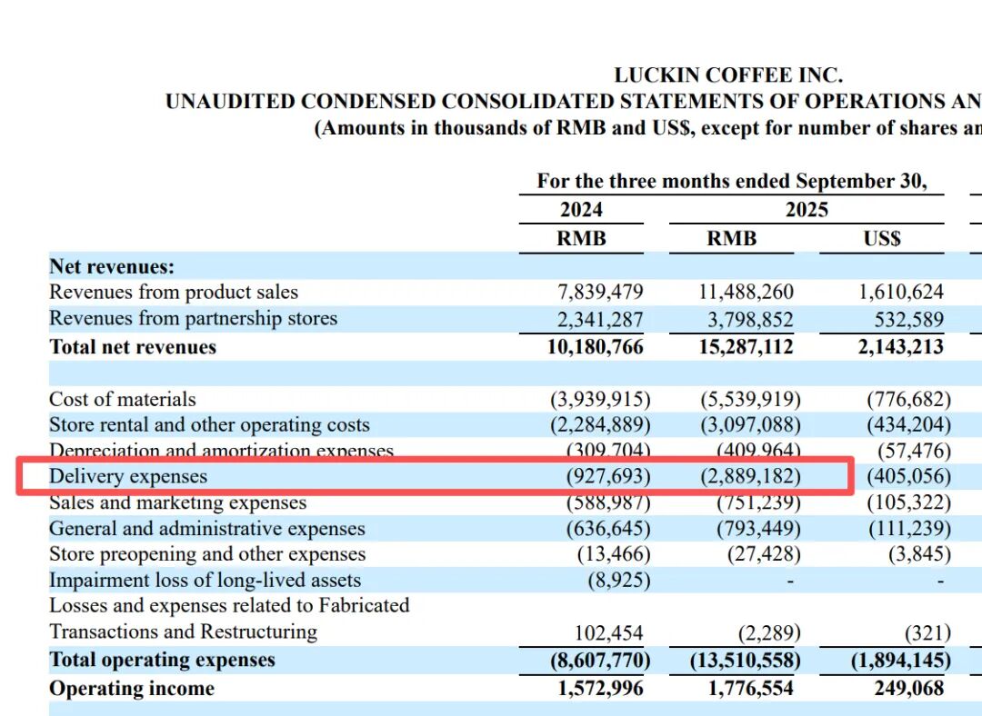 Core Insights - Luckin Coffee's revenue increased by 50.2% year-on-year to 15.287 billion yuan in Q3 2025, while net profit attributable to shareholders decreased by 2.7% to 1.278 billion yuan [1][6] Revenue and Profitability - The primary reason for the revenue growth without corresponding profit increase is the fierce competition in the food delivery market [2] - In Q3, Luckin Coffee added 3,008 new stores, reaching a total of 29,214 stores, marking an 11.5% quarter-on-quarter growth [3] - The average monthly active users reached a historical high of 112 million, a 40.6% year-on-year increase, with 42 million new users added in the quarter [3] Cost Structure and Efficiency - The proportion of raw material costs to total net revenue decreased from 39% in the same period of 2024 to 36%, with raw material costs increasing by 41% to 5.5 billion yuan [4] - Rent and other operating costs as a percentage of total net revenue fell from 22% to 20%, with these costs rising by 36% to 3.1 billion yuan [4] - Sales and marketing expenses as a percentage of total net revenue decreased from 6% to 5%, with these expenses growing by 28% to 751 million yuan [4] - General and administrative expenses also saw a reduction in proportion from 6% to 5%, increasing by 25% to 793 million yuan [4] Delivery Costs and Profit Impact - Delivery costs surged to 2.89 billion yuan, a 211.4% increase, leading to a rise in delivery cost percentage from 9.1% to 18.9%, which reduced operating profit margin to 11.6% [5] - The increase in delivery costs contributed to the decline in net profit, contrasting with Yum China, which saw a 7.8% increase in operating profit [6] Competitive Landscape - The coffee and tea beverage sector is characterized by high-frequency consumption, necessitating competitive pricing to maintain market share [7] - Yum China's higher average transaction value and stronger membership system provide a competitive edge, allowing them to mitigate delivery commission costs [8] Strategic Direction - Luckin Coffee is exploring structural solutions, emphasizing in-store pickup as a primary consumption method, while viewing delivery as a supplementary channel [9] - The company anticipates short-term fluctuations and pressures on same-store sales growth as delivery subsidies decrease [9]