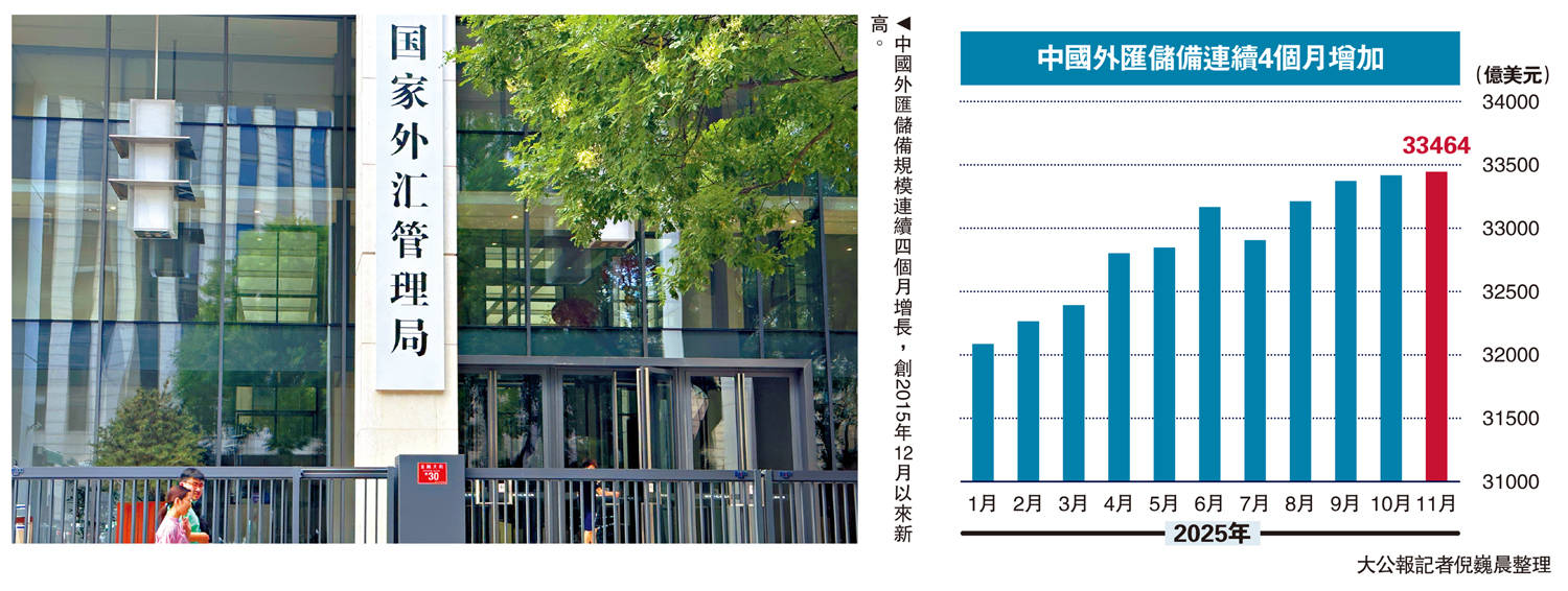 著名经济学家宋清辉指出,外储规模连续增长,表明中国在国际收支、跨境资本流动、汇率与资产价格变动等方面整体保持较稳健状态。从国家 战略角度看,外储规模持续稳定在3.3万亿元或以上水平,可为中国应对外部冲击、维护国际支付能力、确保人民币汇率稳定,以及增加政策空 间等提供"压舱石"。 中国人民银行数据显示,截至11月底,中国外汇储备规模为33464亿元(美元,下同),较10月底增长30亿元或0.09%,已连续四个月增长,创2015年12月 以来新高。分析称,外储规模的持续稳定,预示中国在国际收支、跨境资本流动等方面保持稳健状态。综合内外部因素判断,未来中国外储规模将继续保持 基本稳定,并有望在较高位区间平稳运行。\大公报记者 倪巍晨上海报道 美降息升温 人民币势转强 资产价格方面,温彬提醒,美国降息预期下,11月10年期美债收益率下跌9个基点至4.02厘;当月,投资者对AI盈利前景的忧虑引致美股剧烈分化,月底的 标普500指数与前月齐平,日经指数在科技恐慌情绪蔓延叠加政治因素下大跌4.1%,欧洲斯托克指数则月涨1%。 著名经济学家 宋清辉 著名经济学家宋清辉指出,外储规模连续增长,表明中国在国际收支、跨境资本流动、 ...