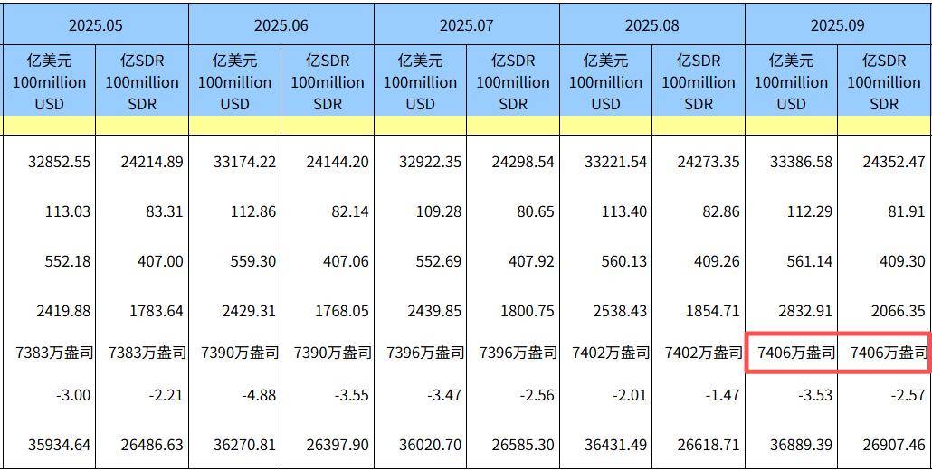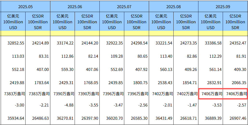 在全球经济格局持续演变的大背景下,中国外汇储备的管理策略正展现出愈发精妙的平衡艺术。国家外汇管理局的最新数据显示,中国人民银行在2024年9 月继续增持黄金,以实际行动诠释了这一策略的转变。经过稳健的净买入,黄金储备总量攀升至7406万盎司的历史新高,彰显了中国优化储备结构的决心。 | 2025.05 | | 2025.06 | | 2025.07 | | 2025.08 | | 2025.09 | | | --- | --- | --- | --- | --- | --- | --- | --- | --- | --- | | 亿美元 | 亿SDR | 亿美元 | 亿SDR | 亿美元 | 亿SDR | 亿美元 | 亿SDR | 亿美元 | 亿SDR | | 100million | 100million | 100million | 100million | 100million | 100million | 100million | 100million | 100million | 100million | | USD | SDR | USD | SDR | USD | SDR | USD | SDR ...