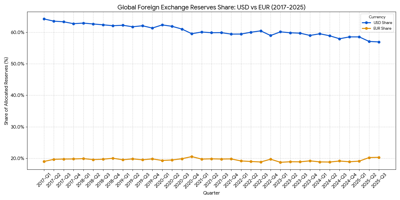 Group 1: Core Insights - The international monetary system is undergoing structural changes due to high interest rates, fiscal sustainability debates, and geopolitical conflicts, leading to a reassessment of "safe assets" like U.S. Treasury bonds [1] - Global official gold reserves surpassed the value of foreign-held U.S. Treasury bonds for the first time in Q2 2025, with gold spot prices increasing nearly 70% [1] - The share of the U.S. dollar in global foreign exchange reserves fell to 56.92% by Q3 2025, marking a 30-year low and indicating a search for a new balance in the global reserve system [2] Group 2: Euro's Position - The euro's share in global foreign exchange reserves reached 20.33% by Q3 2025, maintaining its position as the second-largest reserve currency [3] - The euro's strength against the dollar increased by 13% in 2025, closing the year at 1.16-1.17, despite underlying structural issues within the eurozone [8] - The European Central Bank's monetary policy has diverged from the U.S. Federal Reserve, with the ECB cutting rates multiple times while the Fed also lowered rates, contributing to the euro's appreciation [10] Group 3: Economic Outlook - The eurozone's GDP growth forecast for 2025 was downgraded to 1.3%, with Germany's growth expected to be only 0.3%, highlighting economic vulnerabilities [11] - Significant fiscal measures, such as Germany's €500 billion infrastructure fund and the EU's €800 billion rearmament plan, are seen as crucial for the euro's long-term valuation, though their short-term effectiveness is questioned [11] - Predictions for the euro's exchange rate against the dollar in 2026 vary, with estimates ranging from 1.10 to 1.25, influenced by interest rate differentials and economic recovery [12][13]