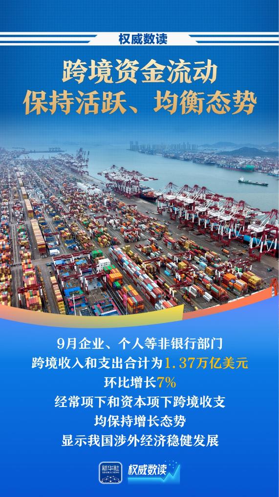 央视网消息:国家外汇管理局10月22日发布数据显示,9月跨境资金流动保持活跃、均衡态势,外汇市场供求较为平衡。 今年前三季度我国涉外收支总规模为11.6万亿美元,创历史同期新高。跨境资金净流入1197亿美元,银行结售汇顺差632亿美 元,均高于上年同期水平。 9月,企业、个人等非银行部门跨境收入和支出合计为1.37万亿美元,环比增长7%。经常项下和资本项下跨境收支均保持增长 态势,显示我国涉外经济稳健发展。受十一假期对跨境收付的季节性影响,9月跨境资金小幅净流出31亿美元,10月以来已转为净 流入。 ...