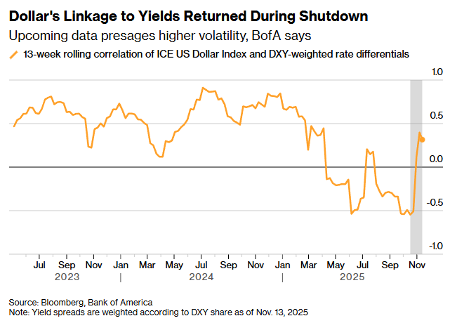 Group 1 - The core viewpoint of the articles is that the end of the U.S. government shutdown and the resumption of economic data releases are expected to increase volatility in the foreign exchange market, particularly for the U.S. dollar [1][2] - Bank of America strategists noted that the sensitivity of the dollar to global interest rates has reached its highest level since the first quarter of this year, indicating potential fluctuations in the dollar as economic data is released [1] - The resumption of data releases is deemed critical, as it may lead to increased volatility in U.S. interest rate differentials, which are significant for foreign exchange traders [1] Group 2 - Recent months have seen a significant decline in measures of currency volatility, attributed to cautious investor assessments of global tariffs and central bank monetary policies [2] - The narrowing of yield differentials, particularly as several central banks, including the European Central Bank, approach the end of their easing cycles, has contributed to a calmer foreign exchange market [2] - The dollar's performance has shifted to reflect growth rather than inflation, as there has been a lack of data to validate economic resilience, leading to a more neutral positioning among investors regarding the dollar [2]