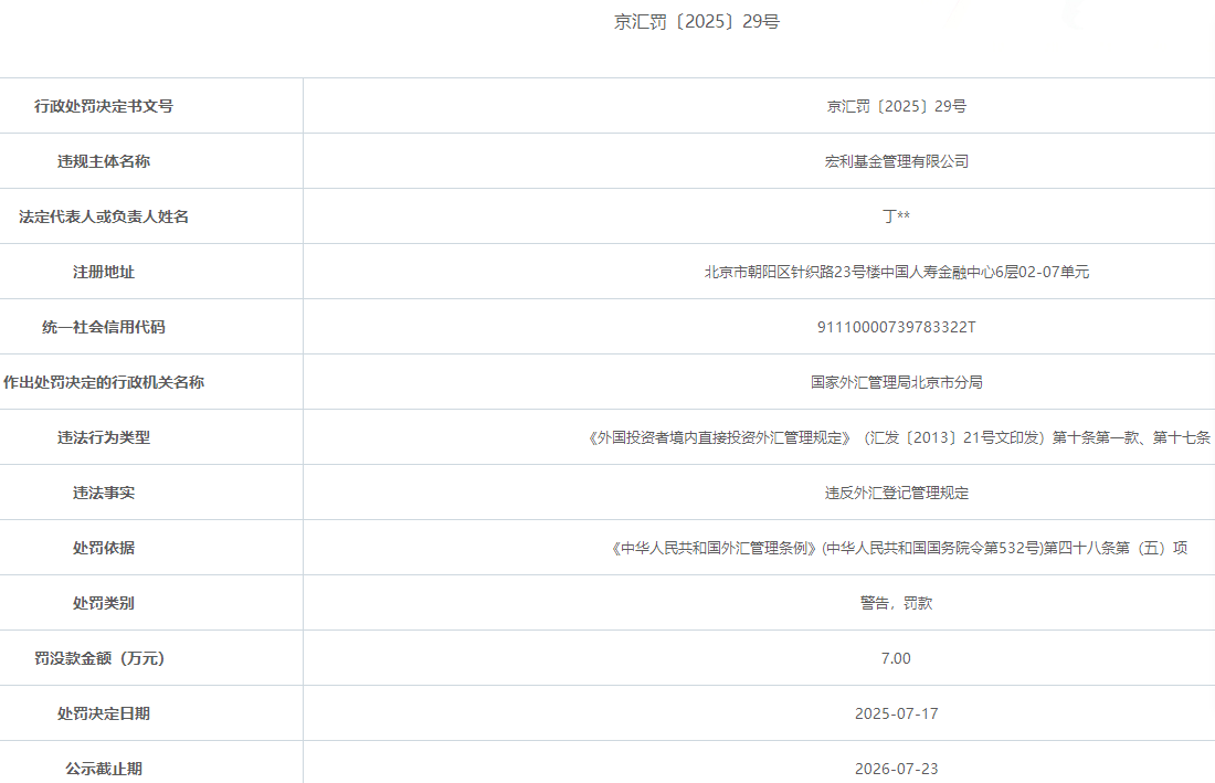《外国投资者境内直接投资外汇管理规定》第十七条:外国投资者通过新设、并购等方式在境内设立金融机构的,参照本规定办理登记。 以下为原文: | 行政处罚决定书文号 | 京汇罚 〔2025〕29号 | | --- | --- | | 违规主体名称 | 宏利基金管理有限公司 | | 法定代表人或负责人姓名 | 丁** | | 注册地址 | 北京市朝阳区针织路23号楼中国人寿金融中心6层02-07单元 | | 统一社会信用代码 | 91110000739783322T | | 作出处罚决定的行政机关名称 | 国家外汇管理局北京市分局 | | 违法行为类型 | 《外国投资者境内直接投资外汇管理规定》 (汇发〔2013〕21号文印发) 第十条第一款、第十七条 | | 违法事实 | 违反外汇登记管理规定 | | 处罚依据 | 《中华人民共和国外汇管理条例》(中华人民共和国国务院令第532号)第四十八条第(五)项 | | 处罚类别 | 警告,罚款 | | 罚没款金额(万元) | 7.00 | | 处罚决定日期 | 2025-07-17 | | 公示截止期 | 2026-07-23 | 中国经济网北京7月25日讯 23日,国家外 ...