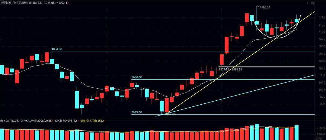 Core Viewpoint - The market showed a mixed performance with a strong Shanghai index and a weaker Shenzhen index, indicating a divergence between large and small stocks, while the overall sentiment remains bullish [1][15]. Market Performance - The market opened at 4144, reached a low of 4124, a high of 4160, and closed at 4132, with a ratio of advancing to declining stocks at 1604 to 3771, indicating more declines than advances [1]. - The closing result at 4135 is deemed acceptable, with the bulls maintaining control but with limited advantage [3][17]. Technical Analysis - The key resistance level for the market is at 4190, which is not expected to be a long-term high point [5]. - The market is currently positioned above the upper boundary of the range 4111-4009, indicating strength, with the next critical point at 4190 [9]. - The ChiNext index is also above its upper boundary of 3319-3220, with a strong point at 3416 [10]. - The 50 index is above its lower boundary of 3067-3042, with a strong point at 3177 [11]. Trading Strategy - The company maintains a position of 70% in its portfolio, with plans for rolling operations while keeping a half or slightly more than half of the positions [6]. - The market's short-term technical indicators suggest that it must stay above the daily life line at around 4113 to maintain a bullish outlook [18]. Key Levels - The critical support and resistance levels for the market are identified as follows: - Resistance: 4153, 4160, 4179 - Support: 4124, 4113, 4103 [19]. - For the ChiNext index, the strong and weak dividing line is at 3383, with resistance at 3353, 3367, 3371 and support at 3304, 3290, 3280 [19]. Conclusion - The market is in a phase of a tug-of-war between bulls and bears, with the potential for the bulls to face challenges if they do not exert more effort [4][15].