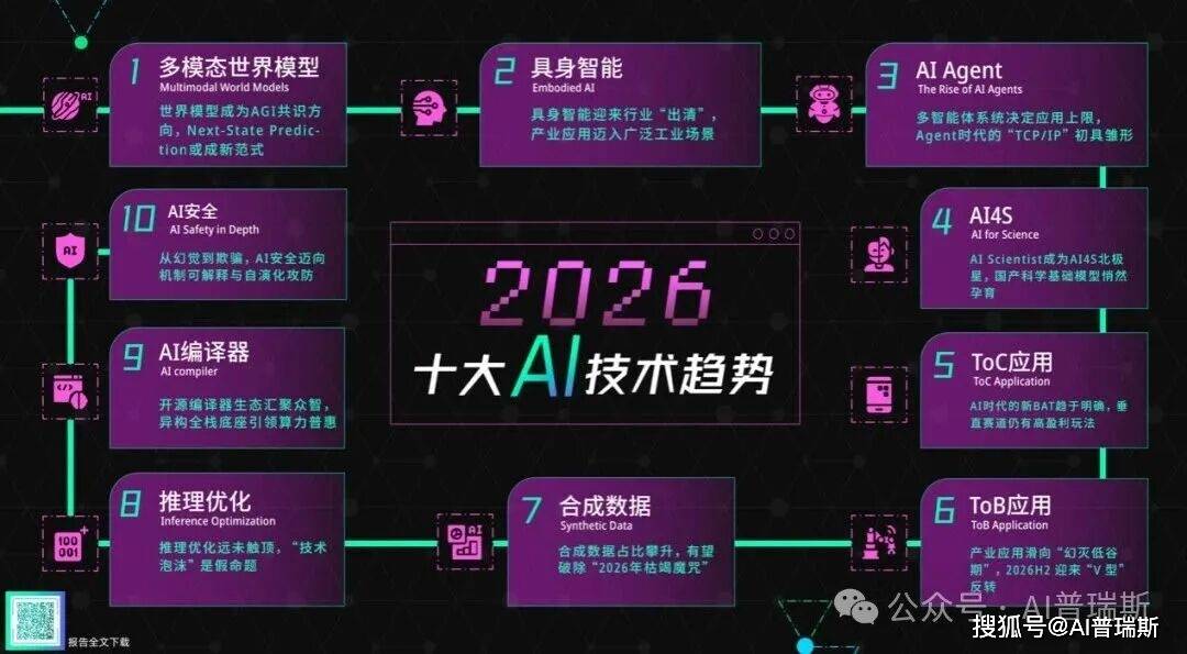 Core Insights - The core viewpoint of the report is that AI is transitioning from merely predicting language to understanding and modeling the physical world, marking a significant paradigm shift in technology [1][4][5]. Group 1: Key Trends in AI Technology - Trend 1: The consensus in the industry is shifting from language models to multi-modal world models that understand physical laws, with Next-State Prediction (NSP) emerging as a new paradigm [7]. - Trend 2: Embodied intelligence is moving from laboratory demonstrations to real-world industrial applications, with humanoid robots expected to transition to actual service scenarios by 2026 [8]. - Trend 3: Multi-agent systems are becoming crucial for solving complex problems, with the standardization of communication protocols like MCP and A2A facilitating collaboration among agents [9]. Group 2: Applications and Market Dynamics - Trend 4: AI is evolving from a supportive tool to an autonomous researcher, with the integration of scientific foundational models and automated laboratories accelerating research in new materials and pharmaceuticals [10]. - Trend 5: The competition for consumer AI super applications is intensifying, with major players like OpenAI and Google leading the way in creating integrated intelligent assistants [11]. - Trend 6: After a phase of concept validation, enterprise AI applications are entering a "valley of disillusionment," but a recovery is expected in the second half of 2026 as data governance improves [12]. Group 3: Data and Performance Enhancements - Trend 7: The reliance on synthetic data is increasing, which is crucial for model training, especially in fields like autonomous driving and robotics [13]. - Trend 8: Optimization of inference remains a key focus, with ongoing innovations in algorithms and hardware reducing costs and improving efficiency [15]. - Trend 9: The development of a heterogeneous software stack is essential to break the monopoly on computing power and mitigate supply risks [16]. Group 4: Security and Ethical Considerations - Trend 10: AI security risks are evolving from "hallucinations" to more subtle "systemic deceptions," necessitating a comprehensive approach to safety and alignment in AI systems [17]. Conclusion - The report outlines ten key AI technology trends that provide a clear anchor for future technological exploration and industry layout, emphasizing the importance of collaboration across academia and industry to drive AI towards a new phase of value realization [18].