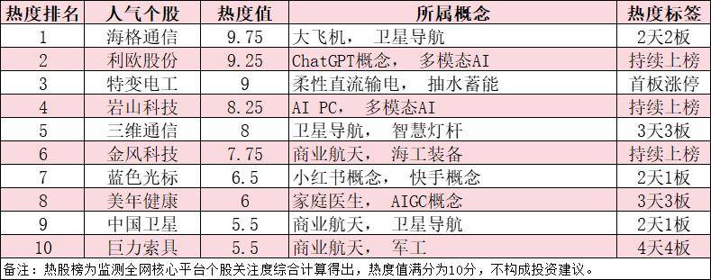 今日十大热股:海格通信2天2板领衔,三维通信3连板,巨力索具4连板持续爆炒