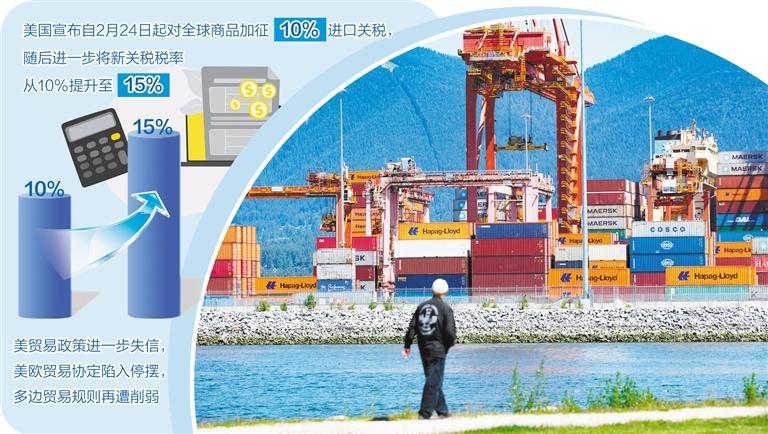 图为加拿大温哥华港口集装箱码头的货柜。 (新华社发) 近期,美国最高法院裁决认定,特朗普政府依据《国际紧急经济权力法》实施的大规模全球关税政策缺乏法 律授权。这一裁决推翻了特朗普政府自2025年上台后以"国家紧急状态"为由绕过国会、单方面加征关税的核 心政策工具。然而,就在最高法院裁决公布后数小时内,特朗普签署行政令,宣布自2月24日起对全球商品加 征10%的进口关税,其随后进一步将新关税税率提升至15%,并威胁称若贸易伙伴"玩花招",将面临更高关 税。特朗普政府"硬刚"最高法院裁决,继续滥用关税措施,美国围绕关税展开的内斗给国际贸易体系稳定性 带来进一步威胁。 美贸易政策进一步失信,美欧贸易协定陷入停摆。特朗普政府加征15%关税的政策,加剧了美欧贸易关系的 不确定性,使得欧盟对批准美欧贸易协议持更加谨慎态度。欧洲议会国际贸易委员会主席朗格通过社交媒体 表示,鉴于美国最高法院裁定美国政府大规模关税政策违法引发的"混乱",他将提议欧洲议会暂停批准欧盟 与美国间的贸易协议。朗格强调,在采取任何进一步措施之前,需要明确规定和法律确定性。欧洲议会国际 贸易委员会原定于2月24日举行会议,对推进批准该贸易协议的相关立法 ...