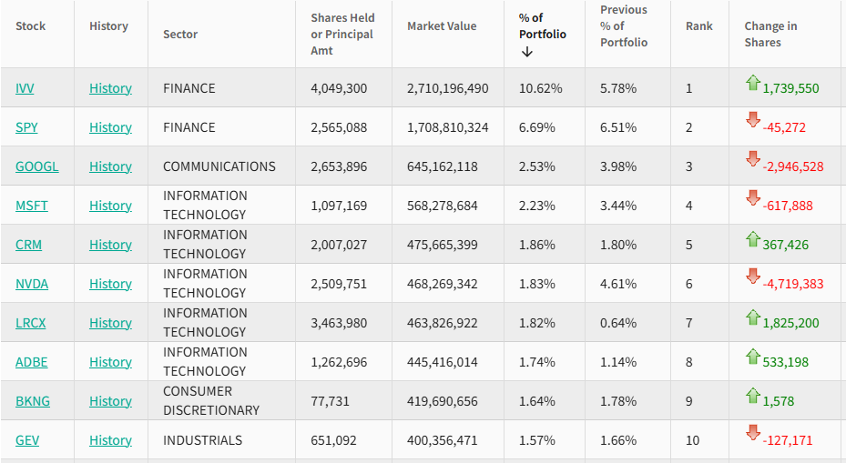 Core Insights - Bridgewater Associates, one of the largest hedge funds globally, reported a total holding of $25.5 billion as of September 30, 2025, an increase from $24.8 billion at the end of the previous quarter [1] - The fund increased its positions in 325 securities, reduced its holdings in 194, initiated positions in 493 new securities, and completely exited 64 positions during the third quarter [1] - The top two holdings remain the iShares Core S&P 500 ETF (IVV) and SPDR S&P 500 ETF (SPY), with a portfolio concentration of 32.54% in the top ten holdings [1] Holdings Summary - The largest holding, IVV, comprises 10.62% of the portfolio, with a market value of approximately $2.71 billion, while SPY accounts for 6.69% with a market value of about $1.71 billion [2] - Nvidia (NVDA) dropped from the third to the sixth largest holding, with a significant reduction of 4.72 million shares, marking a 65.3% decrease from the previous quarter [2][3] - Other notable holdings include Alphabet (GOOGL), Microsoft (MSFT), and Lam Research (LRCX), with GOOGL seeing a reduction of 2.94 million shares [2][3] Top Buys and Sells - The top buys for the quarter included IVV, LRCX, Adobe (ADBE), Sea Ltd, and Reddit Inc, with IVV seeing a 4.83% increase in portfolio allocation [4] - Significant sells included Nvidia, iShares Core MSCI Emerging Markets ETF (IEMG), and SPDR Gold Shares ETF (GLD), indicating a cautious outlook on these assets [4][5] Market Outlook - Ray Dalio, the founder of Bridgewater, warned that the U.S. economy may be entering the later stages of a "big debt cycle," suggesting that the current bull market driven by tech stocks may continue in the short term due to ongoing AI trends [5] - Dalio indicated that once inflation risks resurface, companies with tangible asset attributes, such as those in mining and infrastructure, may outperform pure tech companies [5]