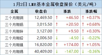 LME三个月期铜上涨46.5美元,或0.37%,收报每吨12,469.5美元。期铜是LME市场2025年表现最佳的 金属,年涨幅达42%,在12月29日创下每吨12,960美元的历史新高。 国家统计局周三公布数据显示,12月份中国制造业PMI为50.1%,4月份以来首次升至扩张区间。在调查 的21个行业中有16个行业PMI较上月回升,相关企业生产经营情况有所改善。 LME三个月期铝上涨20.5美元,或0.68%,收报每吨3,015.5美元。 由于供应过剩,镍价数月徘徊在低位,但在印尼提议2026年将矿石产量削减三分之一后,镍价在12月上 涨了12.3%。矿业部长Bahlil Lahadalia本周表示,政府将减少矿业产量配额以支撑大宗商品价格。 交易所数据显示,一个实体持有LME镍仓单的30%至40%,而LME的期货持仓集中度报告显示,1月镍 合约存在显著多头头寸,相当于至少40%的未平仓合约。 铝LME铝库存为509,250吨,创10月29日以来的最低水平。 1月2日(周五),伦敦金属交易所(LME)期镍升至14个月以来最高水平,期铝在新年伊始便突破了 3,000美元大关,创下2022年以来的新高。 伦敦时 ...