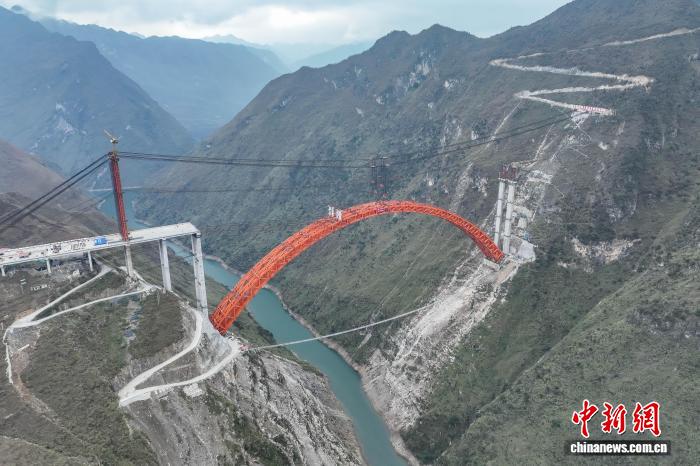 古牛河特大桥全长881.8米,主桥横跨古牛河,采用计算跨径520米的上承式钢箱桁架拱桥。该大桥与目 前世界跨径最大的钢桁拱桥——580米的重庆凤来大溪河特大桥相比,跨径居世界第二。 古牛河特大桥以无支架缆索吊装工艺进行施工,主拱圈最大吊装节段重量约290吨,主桥桥面到谷底高 度约400米,在世界高桥中排名第15位。 1月5日,随着最后一节钢拱精准吊装到位,贵州安顺至盘州高速公路古牛河特大桥顺利合龙。 记 者 瞿宏伦 摄 自2025年6月14日大桥首节段吊装启动以来,项目团队先后克服作业空间受限、构件吊装精度要求严 苛、极端天气频发等多重挑战。 面对主拱圈最大吊装节段约290吨的重量,项目团队在采用自主研发的智慧缆吊系统基础上,首创吊装 轨迹精准控制技术,为节段吊装装上了"智能导航",确保88个节段沿着最优路径平稳、精准抵达预定位 置,有效保证了整个吊装过程安全可控。 贵州安盘高速古牛河特大桥合龙 中新网贵州六盘水1月5日电 (记者 瞿宏伦)5日,随着最后一节钢拱精准吊装到位,贵州安顺至盘州高速 公路古牛河特大桥(以下简称,古牛河特大桥)顺利合龙,大桥主体结构建设取得重大阶段性成果,为后 续工程推进奠定了坚实基 ...