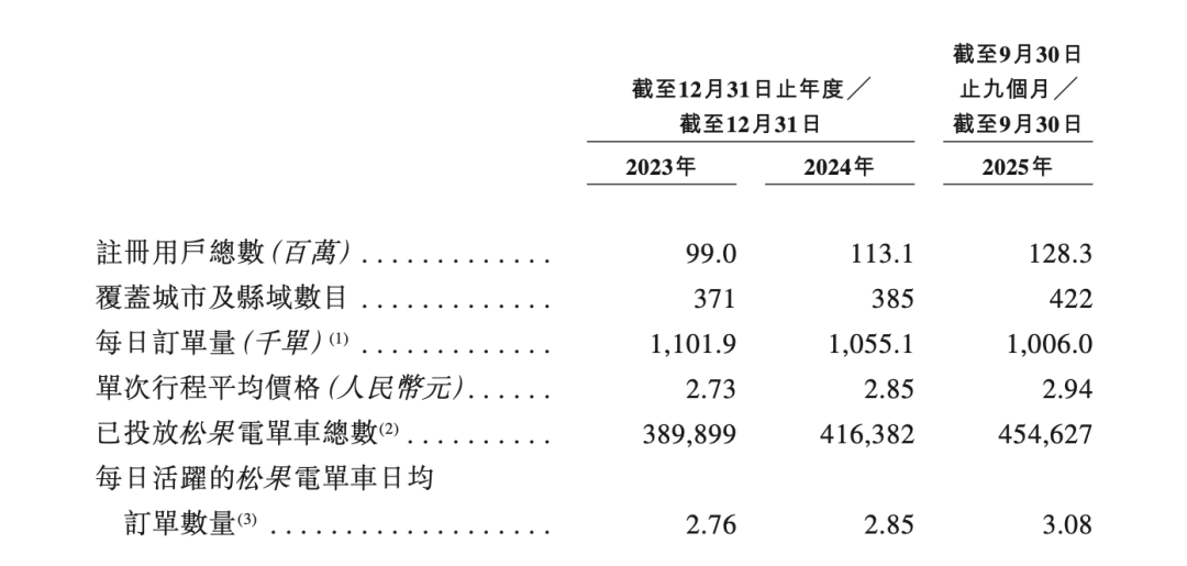 上市申请材料显示,2023年、2024年及2025年前三季度,松果出行营业收入分别为9.53亿元、9.63亿元和7.46亿元,经调整净利润分别为-8808.4万 元、-4407.1万元及2639.6万元,2025年前三季度,松果出行实现扭亏为盈。 2023年、2024年及2025年前三季度,松果出行共享电单车服务业务营业收入分别为9.35亿元、9.34亿元和6.98亿元,占总营收的比重分别为98.1%、97%和 93.6%。 松果出行共享电单车服务业务,主要按每次骑行向用户收取服务费,在用户完成行程时确认共享电单车服务收入。此外,松果出行还为用户提供不同类型 的优惠卡,用户可通过预先付费,在日后每次骑行时享有电单车服务费特定折扣。 1月2日,共享电单车企业松果出行母公司Pinecone Wisdom Inc递表港交所,华泰国际担任独家保荐人。 松果出行主攻县域市场,截至2025年9月30日,松果出行注册用户为1.28亿,已投放的松果电单车总数为45.46万辆。2025年前三季度,松果出行经调整净 利润为2639.6万元,2023年及2024年,松果出行均处于亏损状态。 每日订单量逐年减少 松果出行成立于201 ...