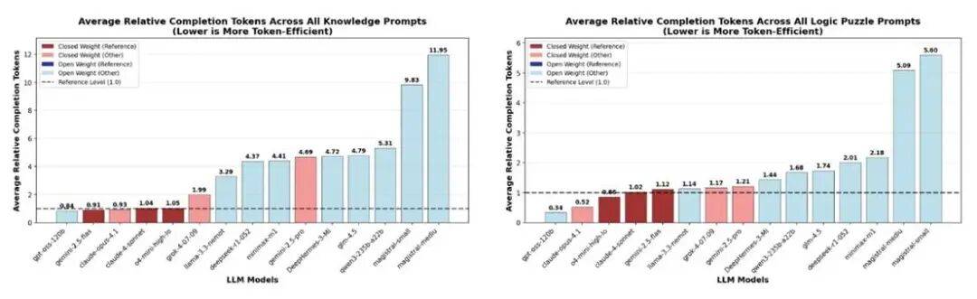 不过,到了需要推理数学题(Math problems)以及更复杂的逻辑谜题(Logic puzzles),DeepSeek-R1-0528消耗的token数量,高出基准水平缩小至2倍左 右。看来实际工作中,向合适的模型询问合适的问题是一大学问。 很多业内人士已经注意到,似乎DeepSeek-R1等开源模型,在回答问题时往往缺乏"节制"。尤其是简单问题,它想得过于复杂了。它的单位token成本的 API价格优势,最终将可能被不受制约的"冗长思考"所侵蚀。 NousResearch团队一项研究,就是想搞清楚,开源权重模型在完成相同任务时,是否系统性地需要比闭源模型更多的token?当将token消耗数量纳入考量 后,这种差异如何影响总体推理成本?这种效率差异在不同的任务类型中是否更加显著? 该研究发现,对于不需要复杂推理就可直答的知识题(Knowledge questions),开源模型的"浪费"最为明显,DeepSeek-R1-0528完成任务消耗的token数量 (completion tokens)——它既包括向用户呈现的输出结果,也包括思维链(CoT),并与实际计费的token数量相匹配——要比基准水平高 ...