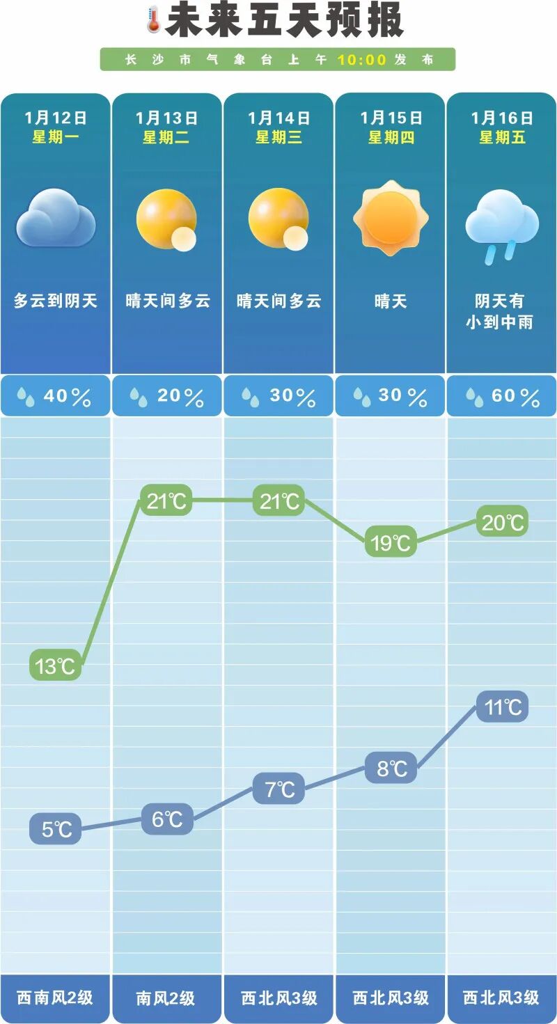 "三九天"里晴暖当道?没错,长沙天气正上演着与时节"错位"的温暖戏码。今日,长沙市气象台发布未来五天天 气预报,显示晴朗干燥将成为天气舞台的"主角",气温更是在"三九"时节里节节攀升,接下来的一周最高气温将 达到21℃左右,暖意十足,颇有几分"阳春三月"提前报到的意味。 具体来看,周一(12日)为多云到阴天,但随后便可迎来连串的晴好天气:周二(13日)、周三(14日)均为"晴 天间多云",周四(15日)直接转为"晴天"。天气转晴的同时,气温也展开"复苏"之旅。日最高气温从周一的 13℃,一路上升至20℃上下,尤其是周二、周三,最高气温预计将达到21℃。这哪里是"冰上走"的三九寒天,午 间在充沛的阳光"帮助"下,体感甚至会有些许暖意。 此外,有湖南省内其他城市出行计划的朋友要注意,湖南省气象台预计,13日清晨湘西部分地区有雾。未来三 天,湖南气象灾害风险则以森林火险、大雾为主。其中,长沙、湘潭、株洲、娄底、衡阳、永州、郴州、邵阳、 怀化(靖州、中方、会同、洪江、通道、沅陵)森林火险气象等级较高;张家界、湘西州、怀化、常德、益阳、 娄底、湘潭、邵阳、永州、衡阳有大雾中等风险气象等级。 总体而言,虽然已至一年中最冷 ...