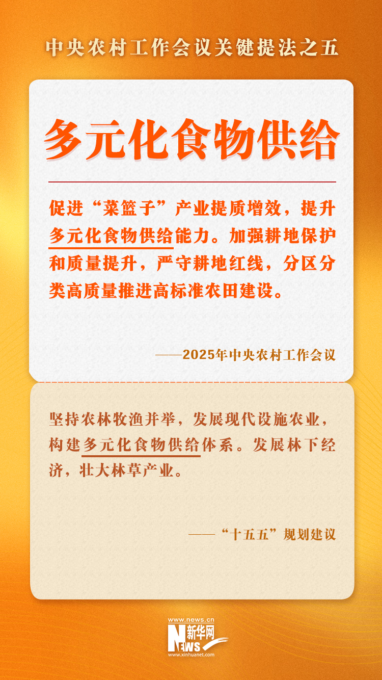 近日召开的中央农村工作会议分析了当前"三农"工作面临的形势和挑战,部署2026年"三农"工作。为 更好帮助网友理解会议精神,新华网梳理了会议提出的部分关键提法,一起来学习。 延展阅读 如何构建多元化食物供给体系? 要构建多元化食物供给体系,在保护好生态环境前提下,从耕地资源向整个国土资源拓展,从传统农作物 和畜禽资源向更丰富的生物资源拓展,向森林、草原、江河湖海要食物,向植物动物微生物要热量、要蛋 白,多途径开发食物来源。(据《习近平谈治国理政》第五卷) 构建多元化食物供给体系。把确保国家粮食安全作为发展农业大产业的首要任务,不断巩固提升粮食综合 生产能力,全方位夯实粮食安全根基。同时,践行大农业观、大食物观,全方位、多途径开发食物资源, 从耕地资源向整个国土资源拓展、从传统农作物和畜禽资源向更丰富的生物资源拓展,广辟食物来源。大 力发展木本粮油生产和林下经济,不断提高森林食品供给能力。推进水域生态保护和渔业资源高效利用相 协调,积极扶持发展深远海渔业。大力发展现代设施种植业、设施畜牧业、设施渔业,建设现代加工物流 等设施,升级技术装备,提高产出多样性和生产效率。(据《党的二十届四中全会〈建议〉学习辅导百 问 ...
