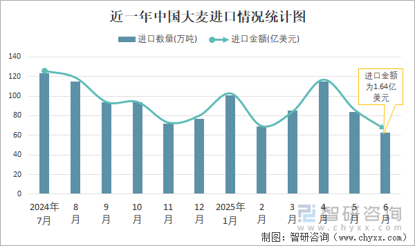 2025年6月中国大麦进口数量和进口金额分别为63万吨和1.64亿美元
