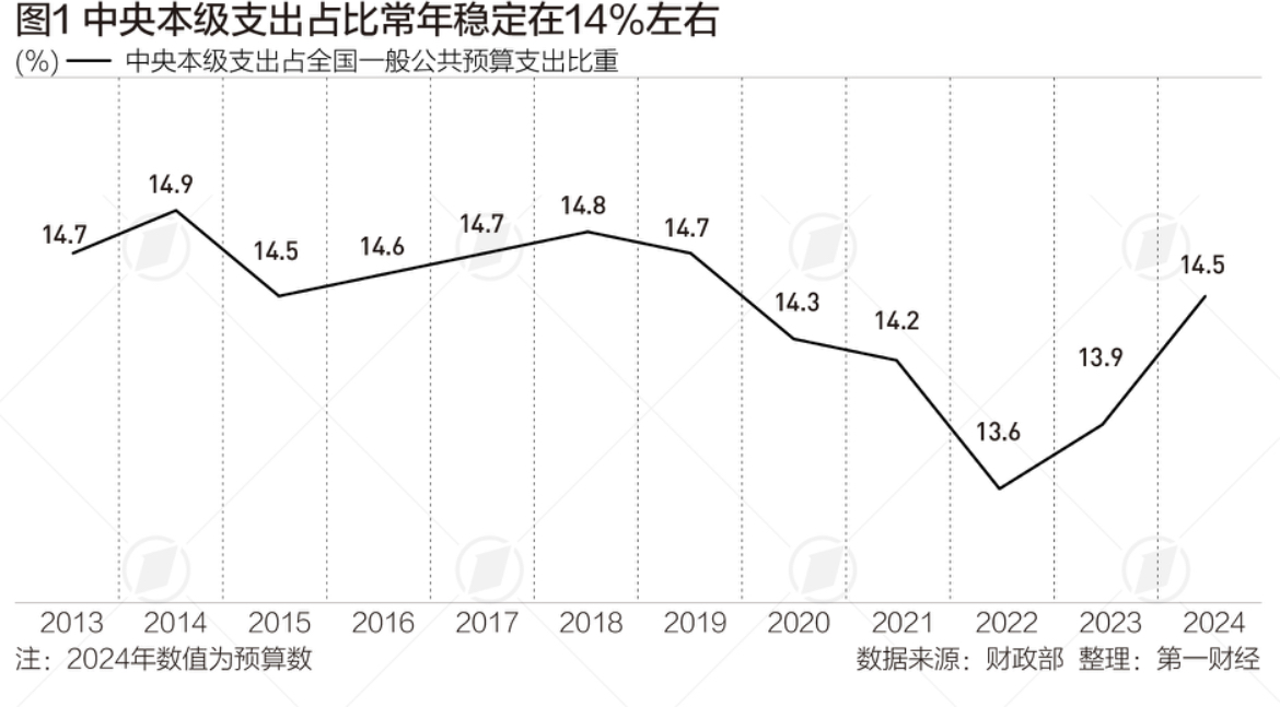 提高中央本级支出并不是简单的记账方式改变,这涉及中央各个部门的责权利的调整,牵涉行政体制改革。 第一财经整理近十来年数据发现,全国一般公共预算中,中央财政本级支出占全国一般公共预算支出比重在14%左右波动,2024年这一比重预计为14.5%, 较2023年略有提高。这也意味着地方财政支出占比常年稳定在86%左右。 为推动经济高质量发展,缓解地方财政支出压力,未来五年中央财政支出比重将提高。 近期,《中共中央关于制定国民经济和社会发展第十五个五年规划的建议》全文对外公开。其中在部署财政工作时,要求"适当加强中央事权、提高中央财 政支出比重"。 近些年受多重因素影响,地方财政收入增长乏力,而地方财政支出占比高,基层"小马拉大车"问题愈加突出,并衍生出地方债务负担重等系列问题。破解这 一问题,除了增加地方自主财力外,关键一招正是让中央政府承担更多事务,减少委托地方代行的中央财政事权,进而提高中央财政支出比重,理顺央地财 政关系。 中央财政支出占比较低 受经济增长放缓、物价楼市低迷、减税降费等影响,地方财政收入增长乏力,而民生、债务等刚性支出持续增长,地方财政收支矛盾不断加大,部分基层财 政比较困难。 为了破解这一难 ...
