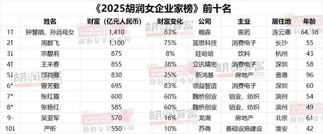 | | | | 《2025胡润女企业家榜》 前十名 | | | | | --- | --- | --- | --- | --- | --- | --- | | | 姓名 | 财富(亿元人民币) | 财富变化 = 公司 | | 主业 | 居住地 - 年龄 | | 11 | 钟慧娟、孙远母女 | VOMEN IN CHIN 410 | 83% | 翰森 | 医药 | 连云港 64. 38 | | 21 | 間群で | 湖湖又正 100 | 75% | 蓝思科技 | 消费电子 | 长沙 રેર્ટ | | 31 | 宗馥莉 | 875 | 8% | 娃哈哈 | 饮料 | 杭州 43 | | 41 | 王来春 | 822 | 38% | 立讯精密 | 消费电子 | 深圳 58 | | 214 | 日 - 三 月 月 - | 830 | 25% | 新鸿基 | 房地产 PORT | 香港 96 | | 6* | 一曾若勤。 | ୧୦୮ | 83% | 领益智造 | 消费电子 | 深圳 60 | | 7* | 张红霞 | 600 | 60% | 魏桥创业 | 铝业、纺织 | 演 54 | | 8* | 张掖红 | ર્  ...
